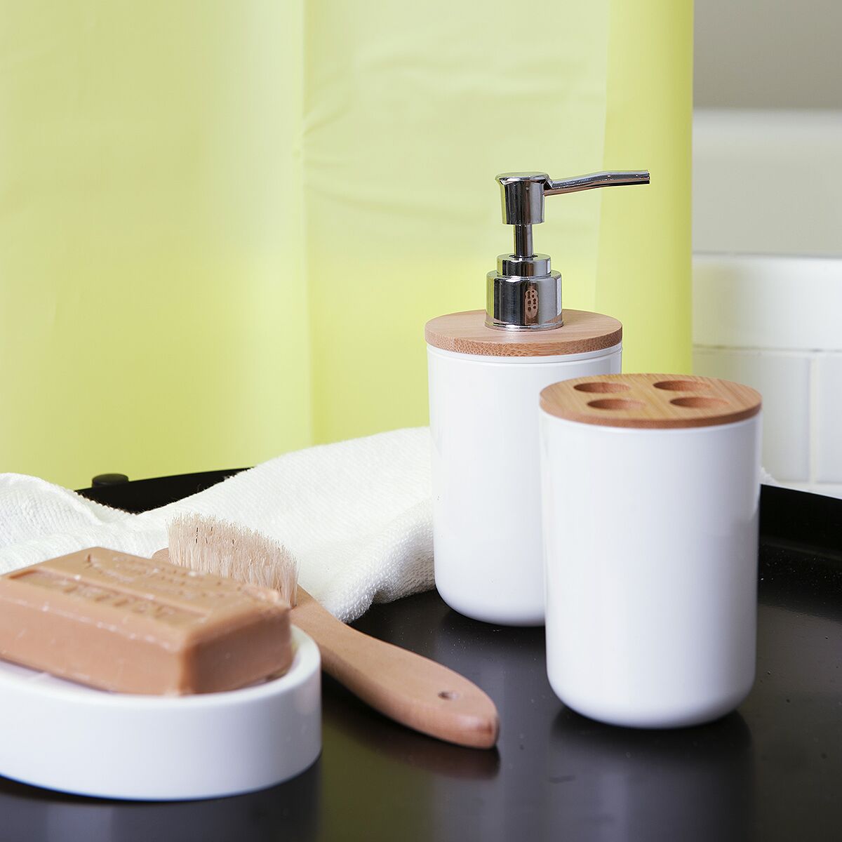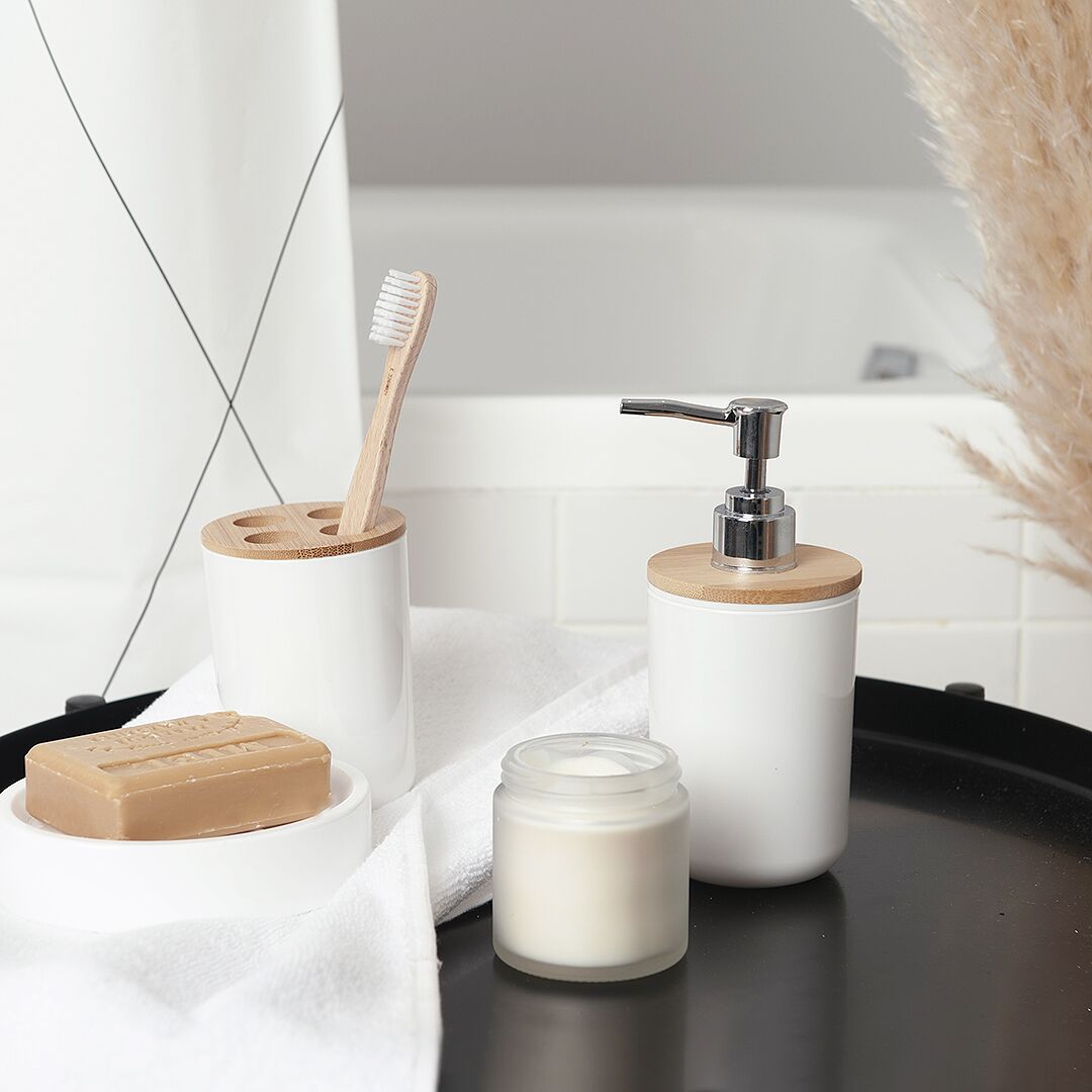 Вес без индивидуальной упаковки: 88г +/- 3г. Вес с упаковкой: 90г +/- 3г. Размер: 7*7*16см, 280мл; насос: высота - 5,2см, d в самой широкой части - 2,2см, длина насадки - 3,3см. Состав: PS , бамбук , помпа ABS. Цвет: ГЛЯНЦЕВЫЙ БЕЛЫЙ + бамбук