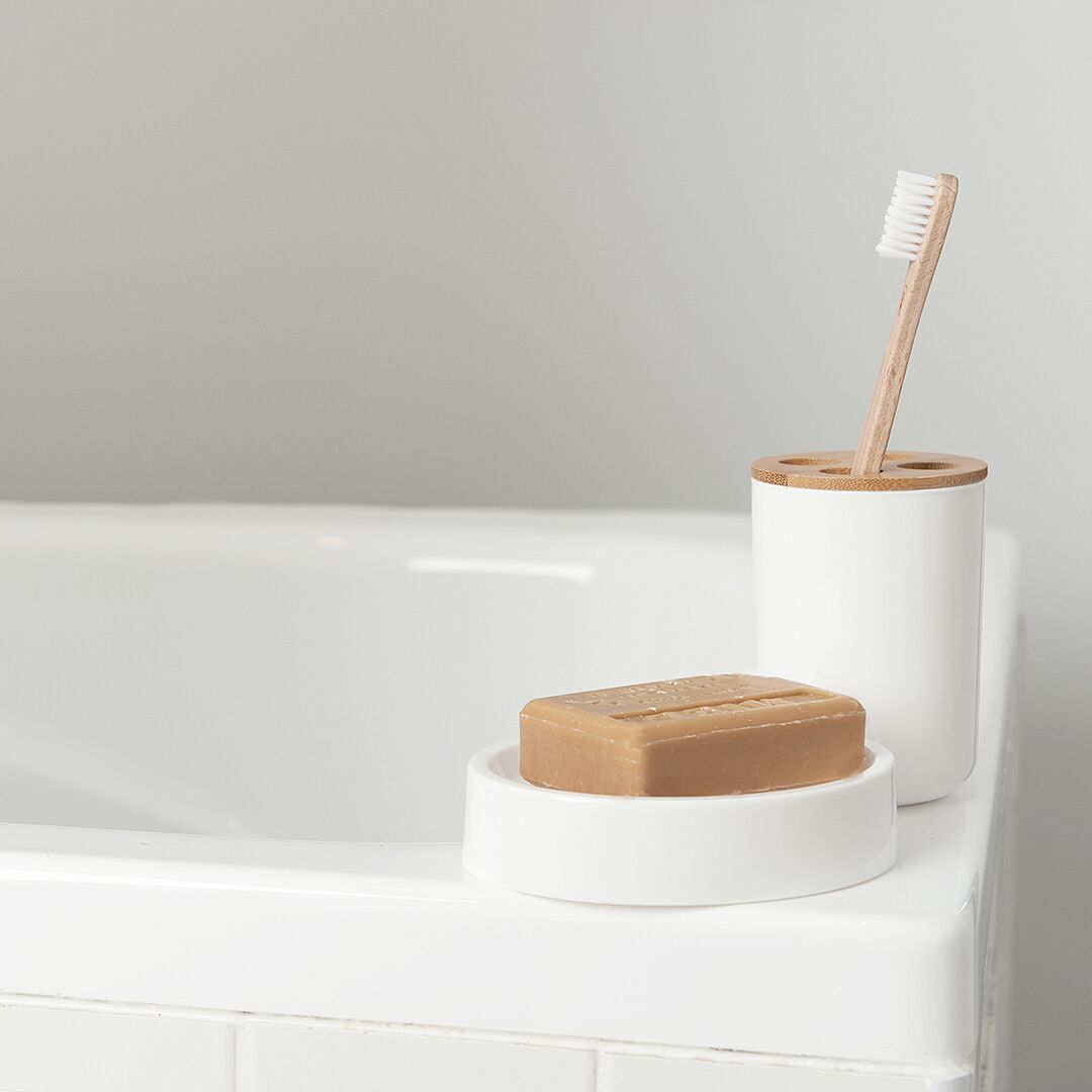 Легкий белый пластик отличная альтернатива керамическим аксессуарам для ванной. Легкий и прочный пластик прослужит долго и станет милым акцентом в ванной.