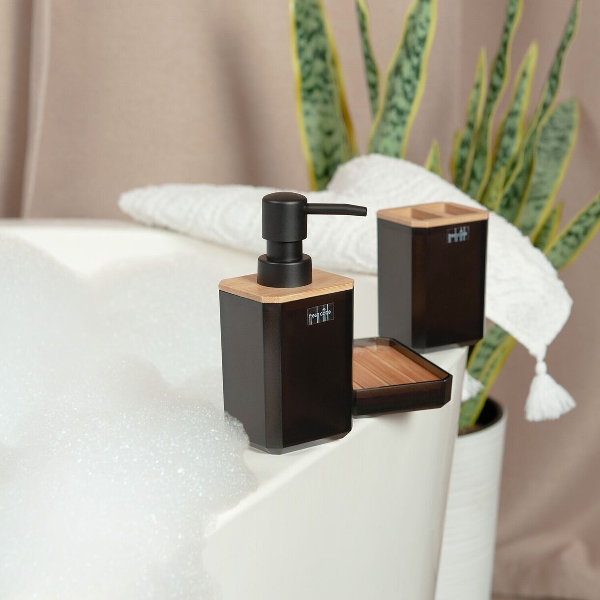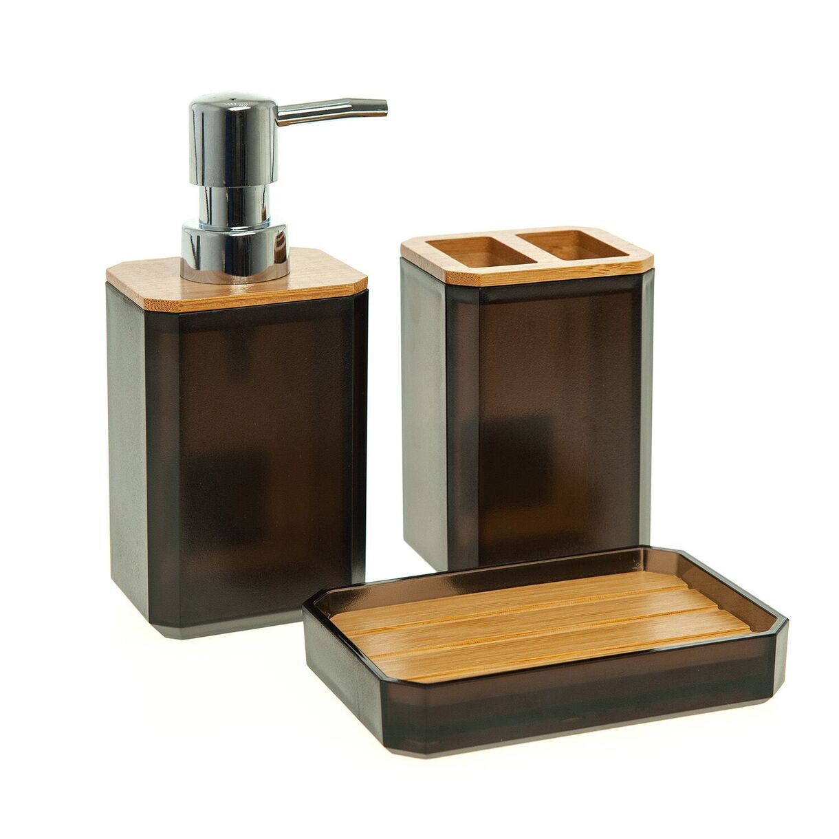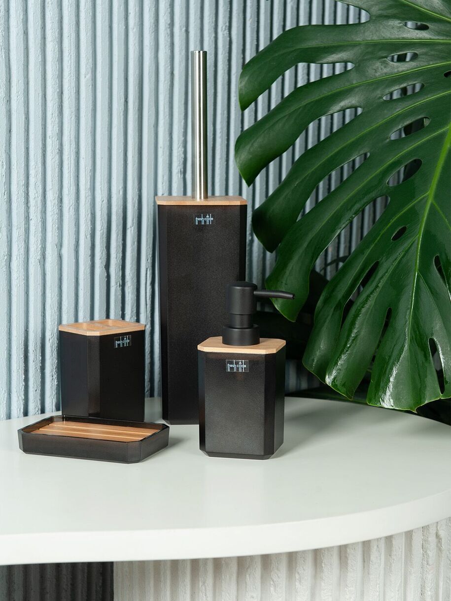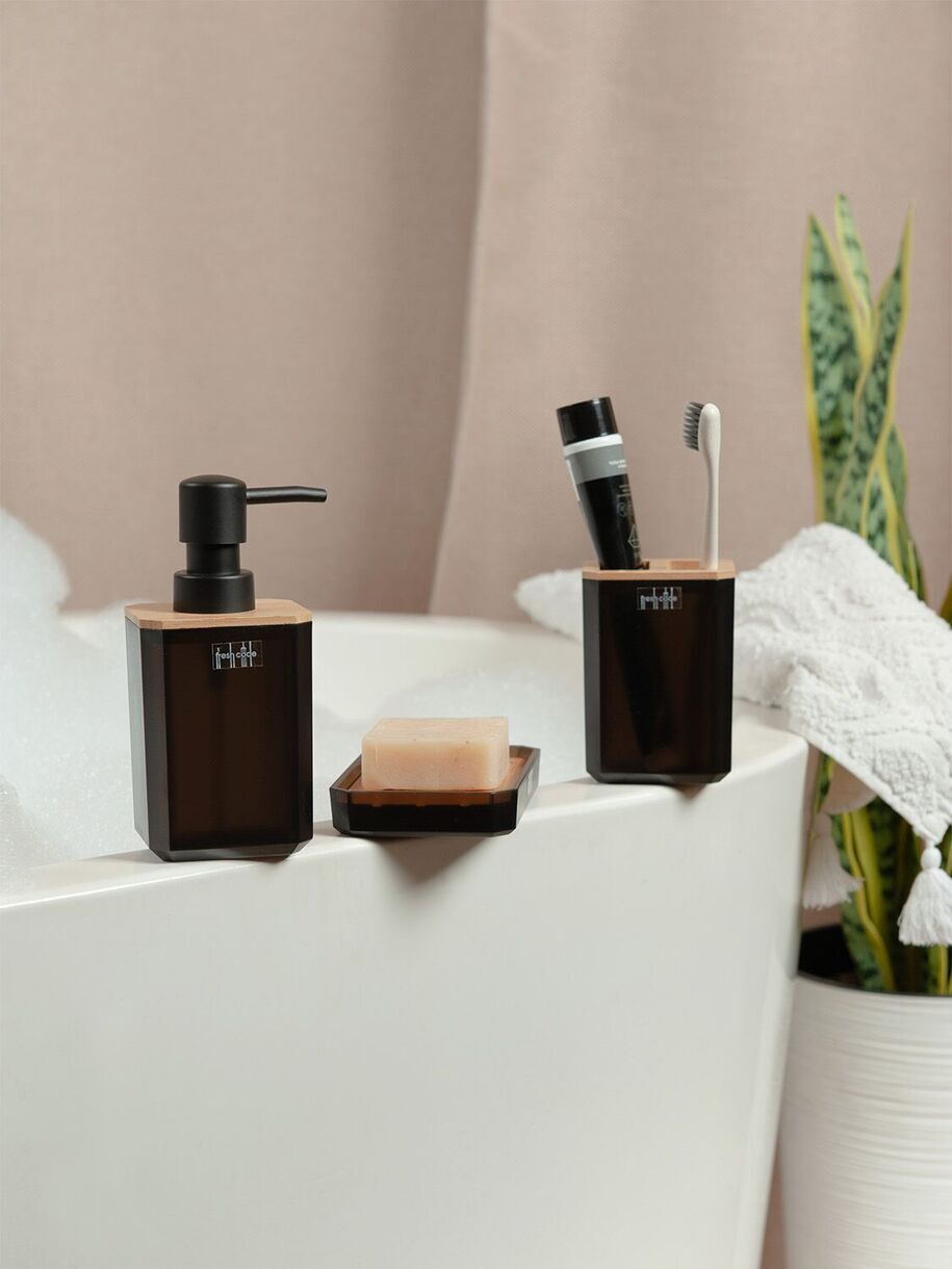 Набор аксессуаров для ванной Экограни станет стильной основой порядка в ванной комнате. Набор включает в себя 3 предмета: дозатор для мыла, стакан для зубных щеток, мыльницу-подставку. Компактный набор аксессуаров выполнен из качественного полистирола. Цвет черный, эффектно полупрзрачный. Актуальное сочетание пластика и бамбука поможет создать и поддержать "стильный" градус интерьера. Необычная форма аксессуаров добавляет оригинальное звучание. Удобная помпа дозатора обеспечит комфортное использование. Стакан для щеток имеет аккуратное разделение, а мыльницу будет легко помыть, тк бамбуковый декор - сьемный. Аксессуары сочетается с ершом для чистки сантихники из коллекции Экограни.