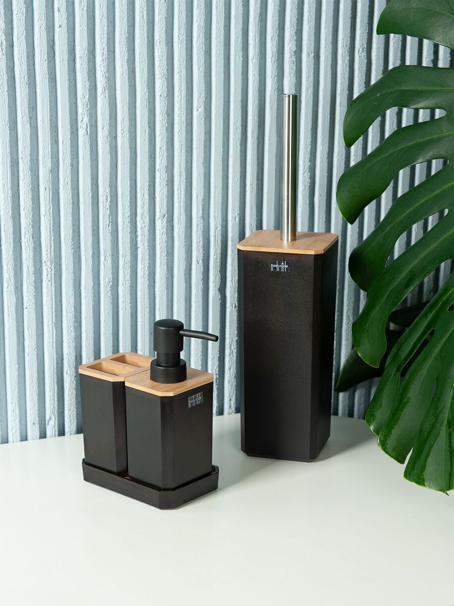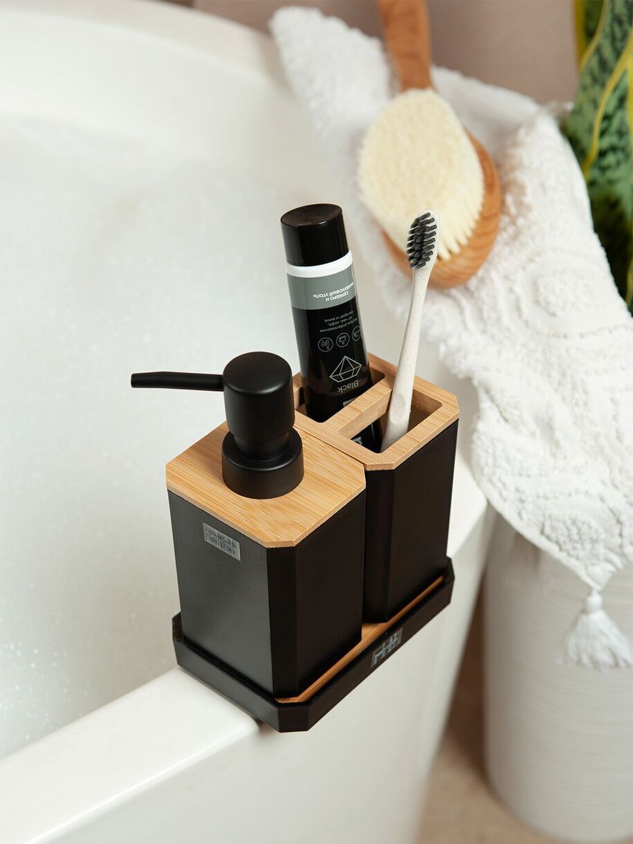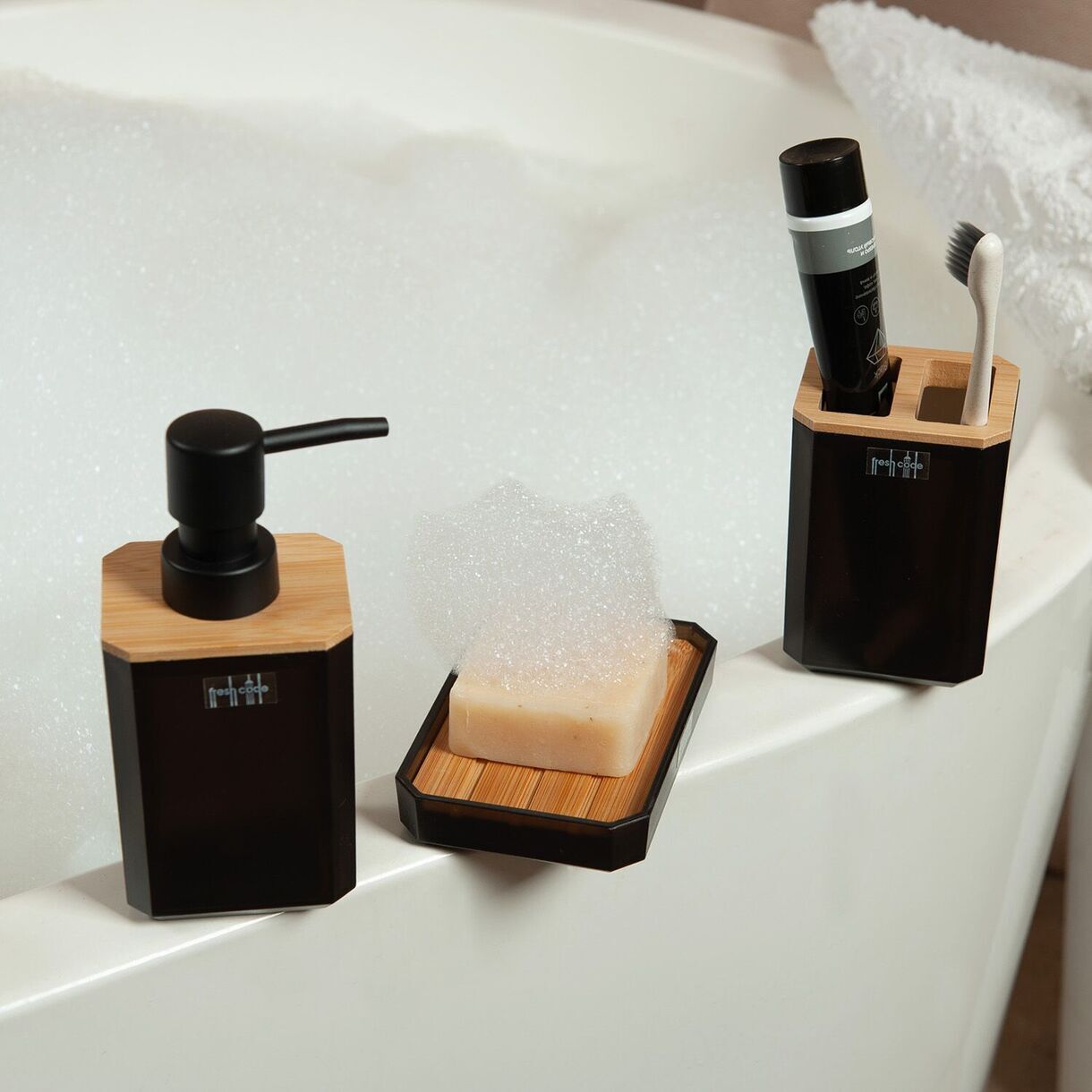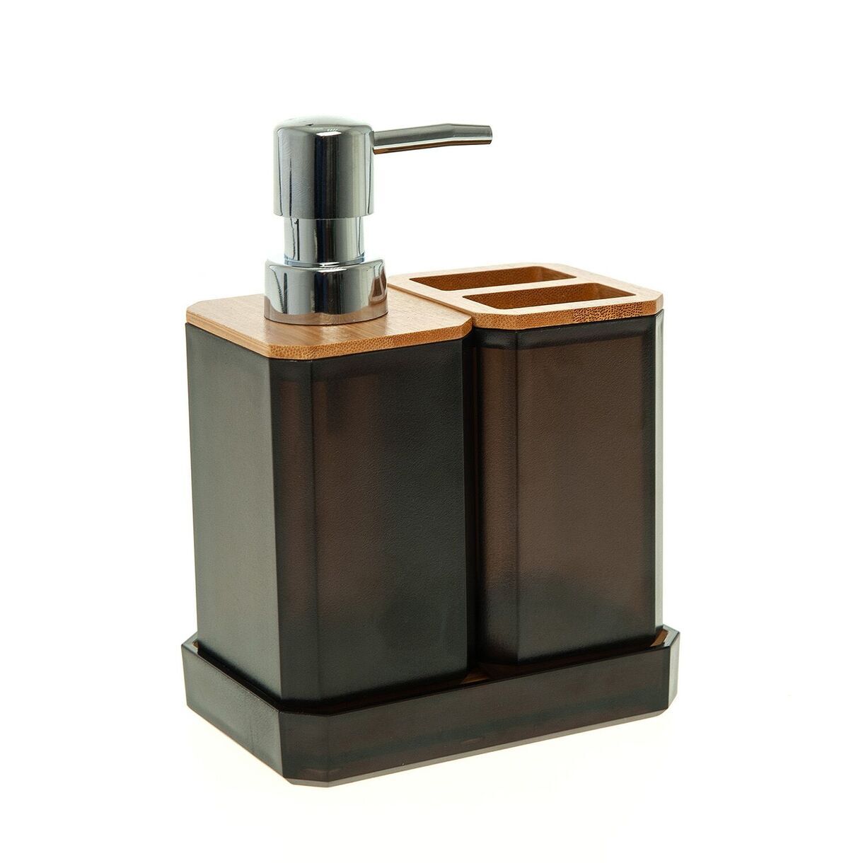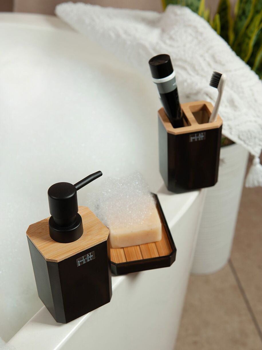 Набор аксессуаров для ванной Экограни станет стильной основой порядка в ванной комнате. Набор включает в себя 3 предмета: дозатор для мыла, стакан для зубных щеток, мыльницу-подставку. Компактный набор аксессуаров выполнен из качественного полистирола. Цвет черный, эффектно полупрзрачный. Актуальное сочетание пластика и бамбука поможет создать и поддержать "стильный" градус интерьера. Необычная форма аксессуаров добавляет оригинальное звучание. Удобная помпа дозатора обеспечит комфортное использование. Стакан для щеток имеет аккуратное разделение, а мыльницу будет легко помыть, тк бамбуковый декор - сьемный. Аксессуары сочетается с ершом для чистки сантихники из коллекции Экограни.