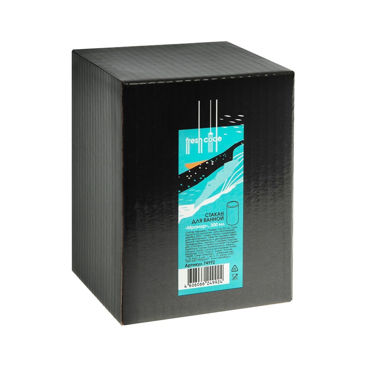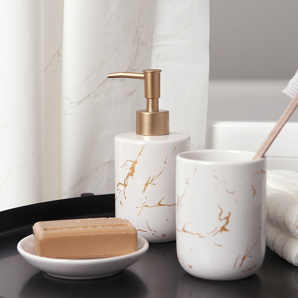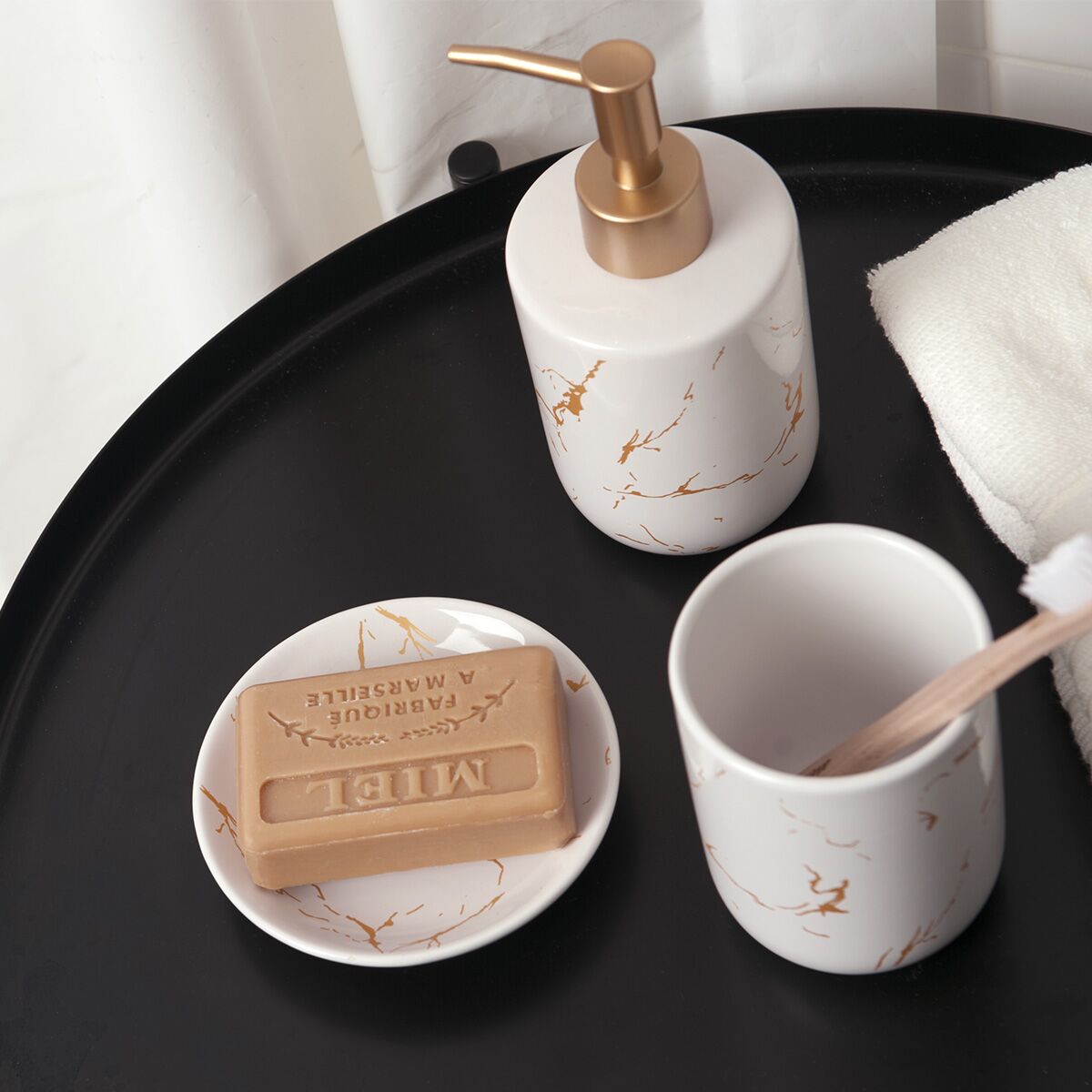 В коллекции "Мрамор" также представлена мыльница и диспенсер из керамики. В дополнение к к керамическим аксессуарам можно подобрать коврики и штору для ванной с аналогичным принтом.