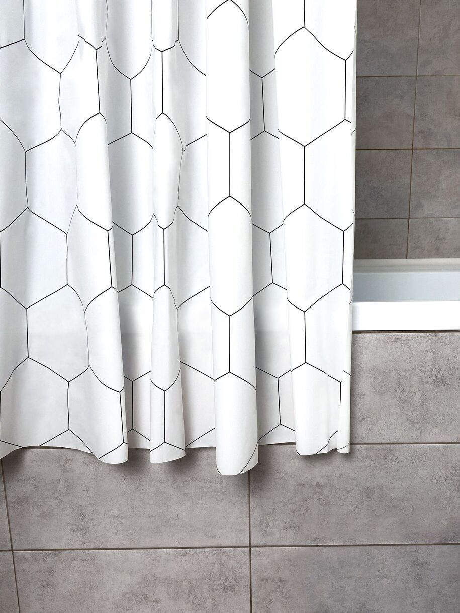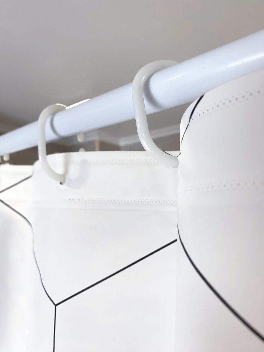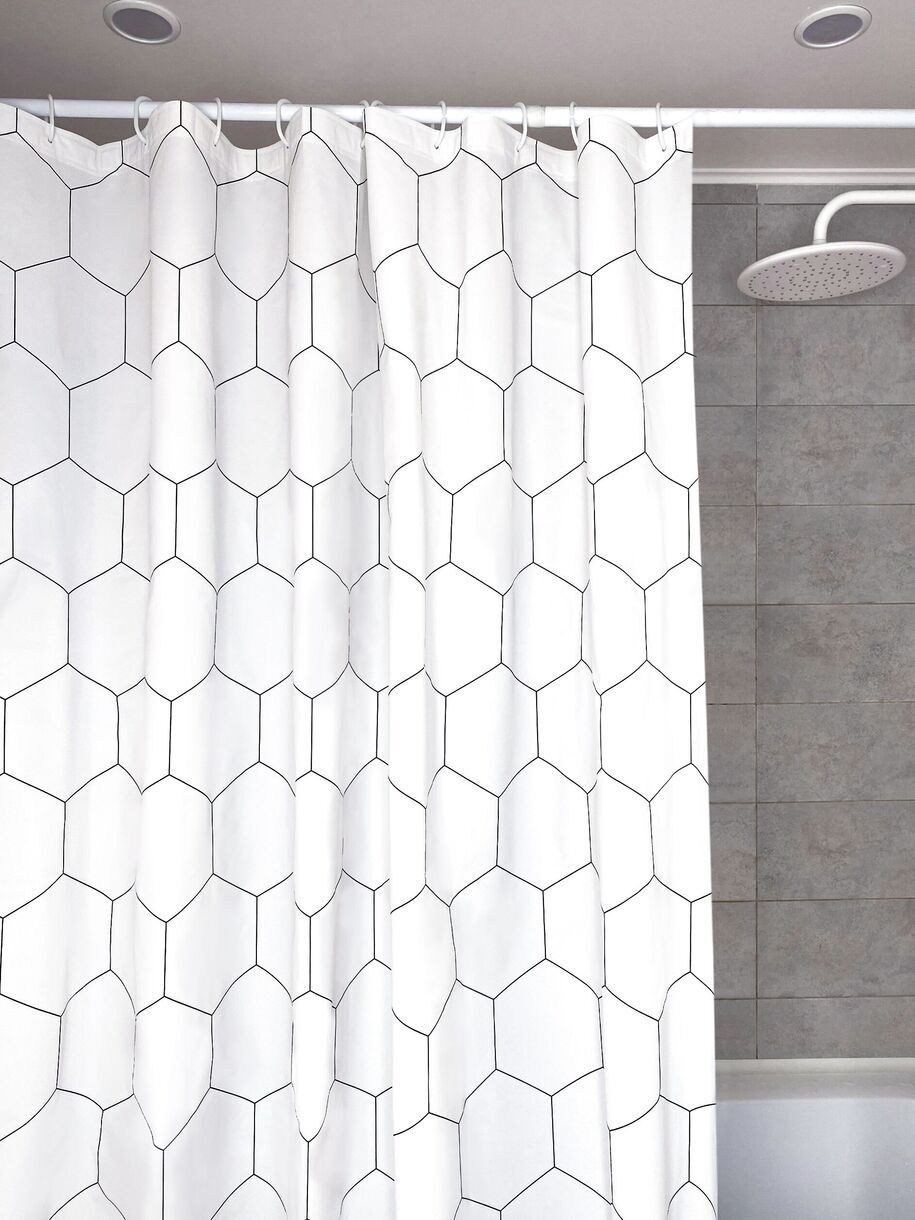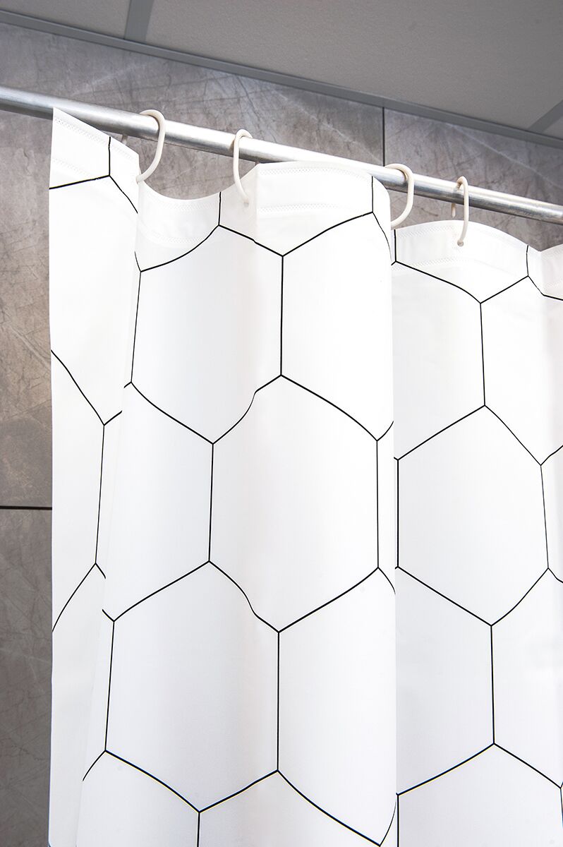 Вес без индивидуальной упаковки: 318 г +/- 10 г. Вес с упаковкой: 358 г +/- 10 г. Размер: 180*180 см, кольцо 5,5*3,9 см. Состав: ПЕВА (50% ЭВА, 50% ПЭ) 90 г/м2 12 колец из полипропилена в комплекте. Цвет: Белый + Черный геометрический принт.