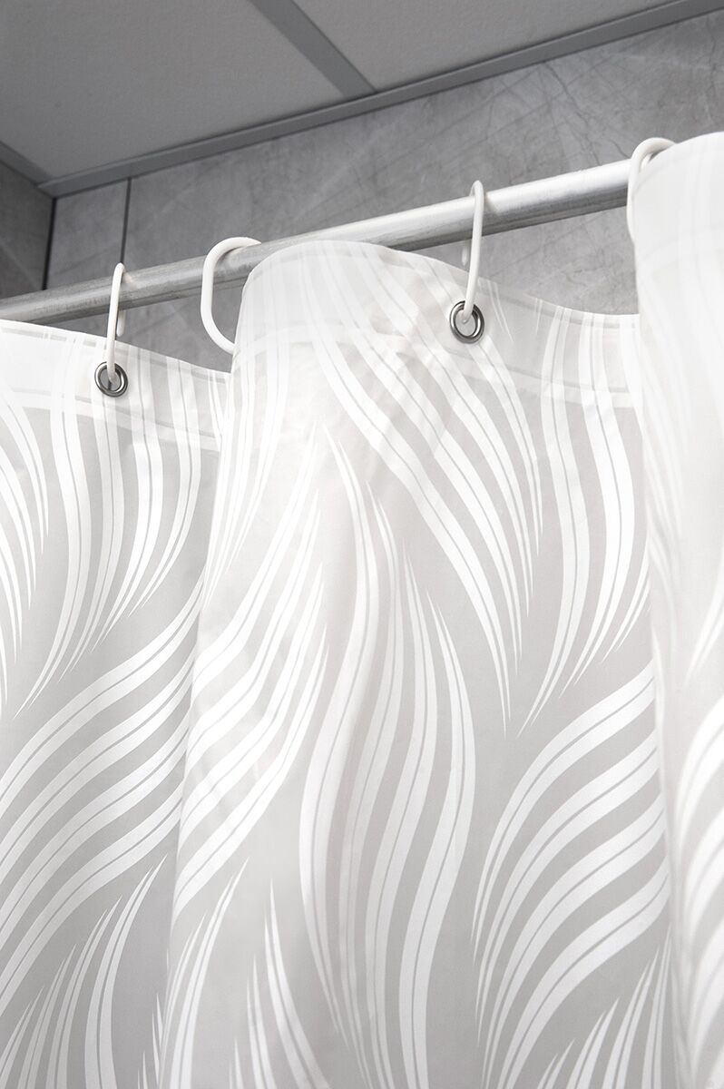 Штора не пропускает воду, легко чистится, отверстия для колец обрамлены люверсами.