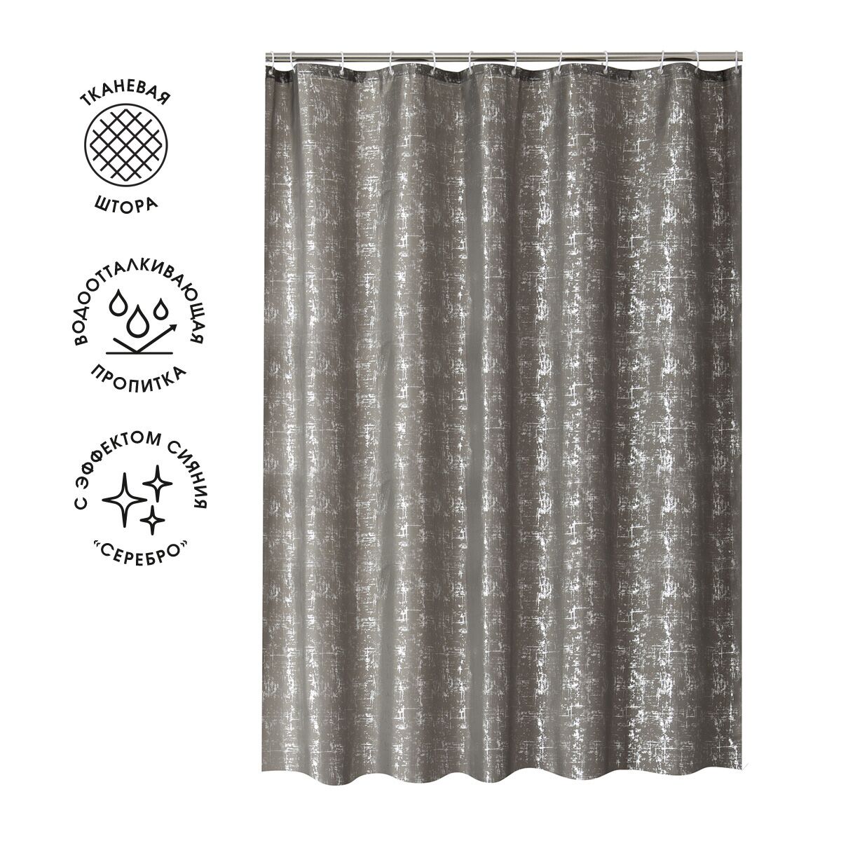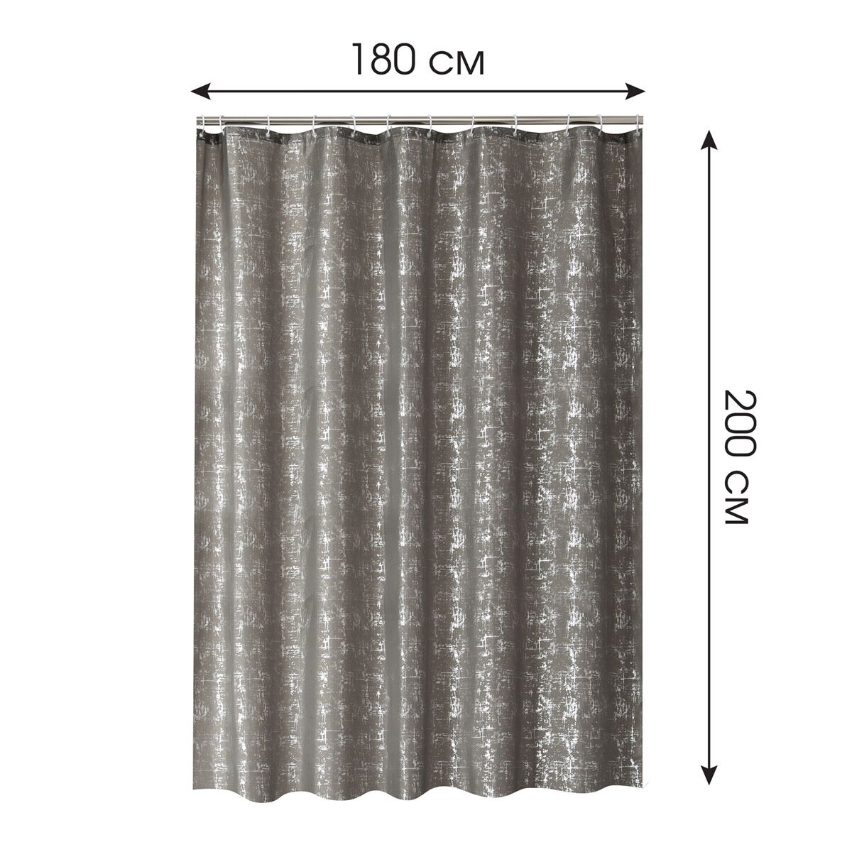 Вес без индивидуальной упаковки: 350 г +/- 10 г. Вес с упаковкой: 410 г +/- 10 г. Размер: 180*200 см, кольцо 5,5*3,9 см. Состав: штора - 100% полиэстер, 90 г/м2, водоотталкивающая пропитка, люверсы - нерж. сталь 201, кольца - полипропилен. Цвет: бежево-коричневый, пудровое напыление "серебро".