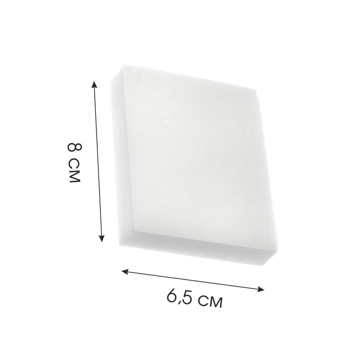Вес без индивидуальной упаковки: 1+/-0,3г. Вес с упаковкой: 1+/-0,3г. Размер: 15*65*80(+/-2)мм. Состав: 100% меламин 8кг/м3. Цвет: Белый.