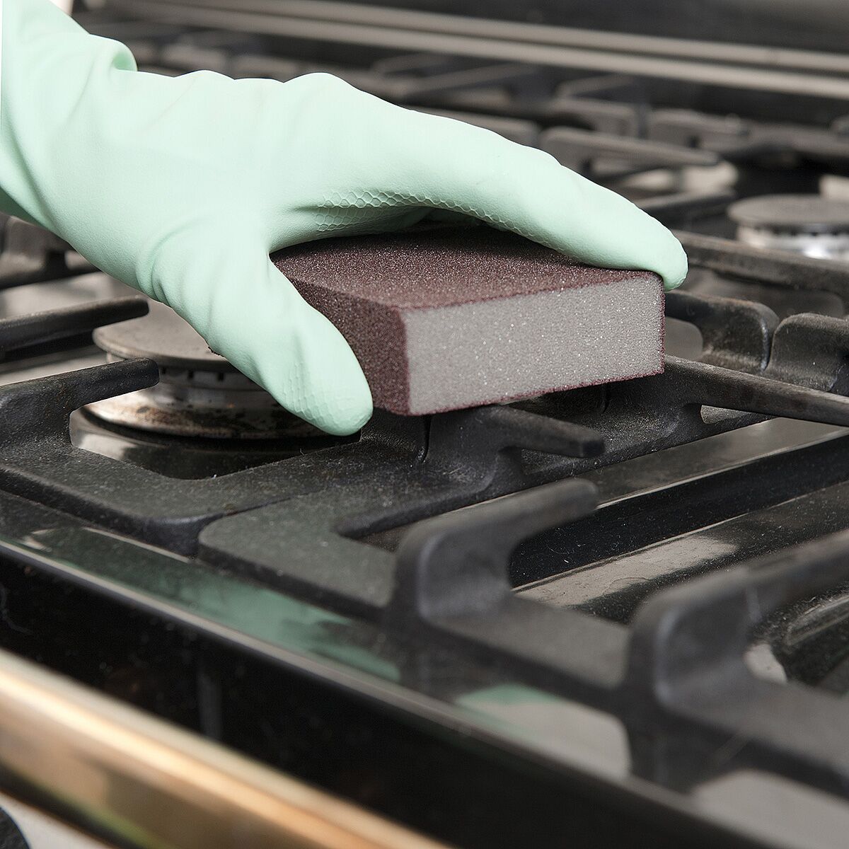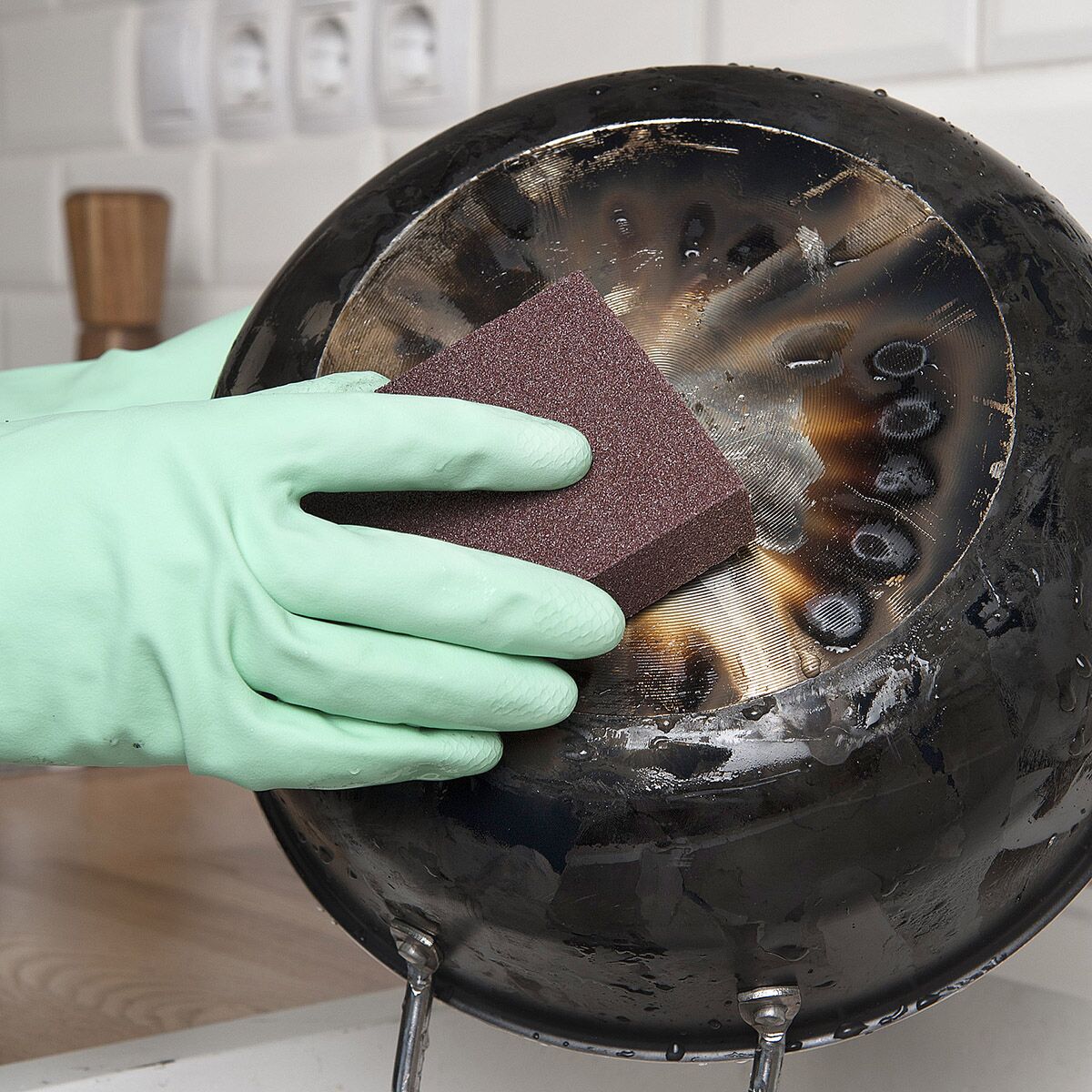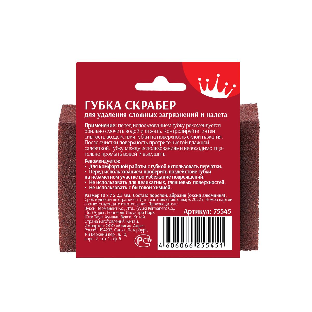 Губка скрабер Home Queen превосходно справляется со сложными загрязнением и налетом без применения моющих средств. При намокании абразивный слой становится мягким, поверхность приобретает губчатую структуру. После использования хорошо промывается под струей воды. Очищает: пригар, белый налет, жирные пятна, кусочки засохшей еды.
