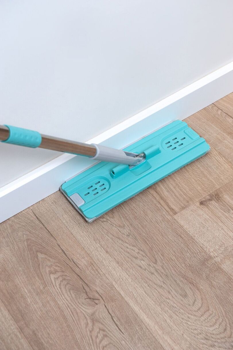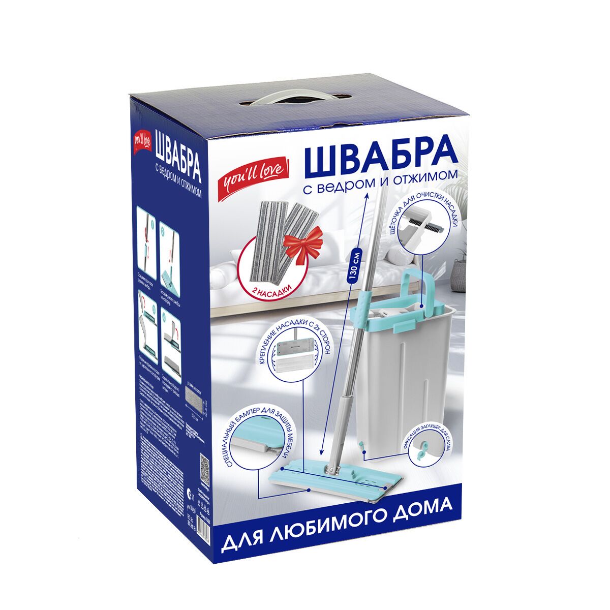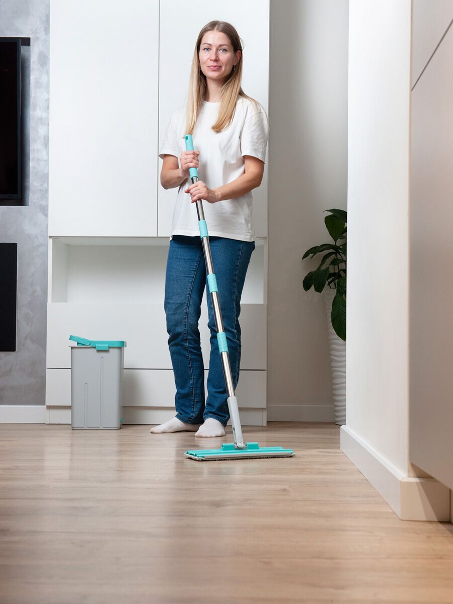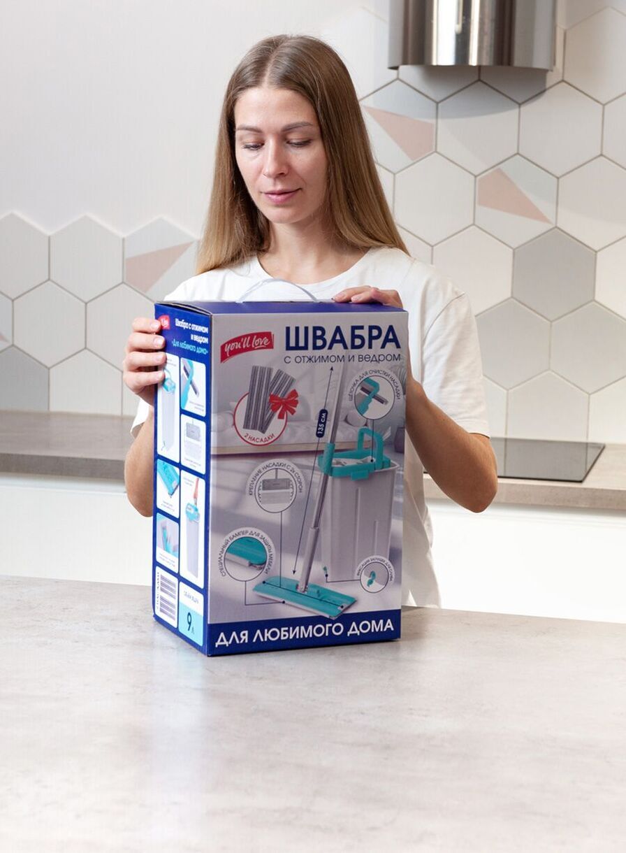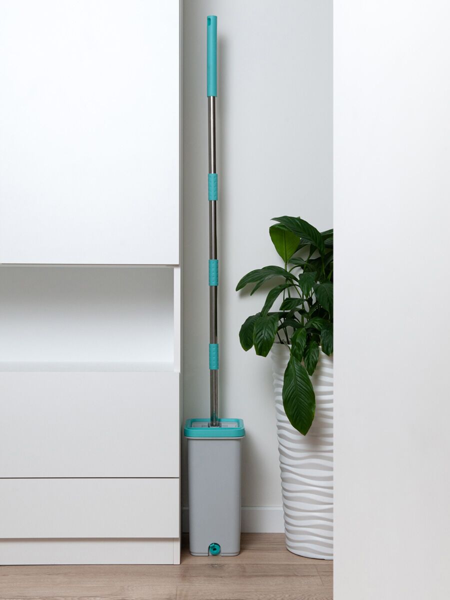 Комплектация - ведро с системой отжима, швабра плоская с цельной платформой, 2 насадки из микроволокна с коротким ворсом