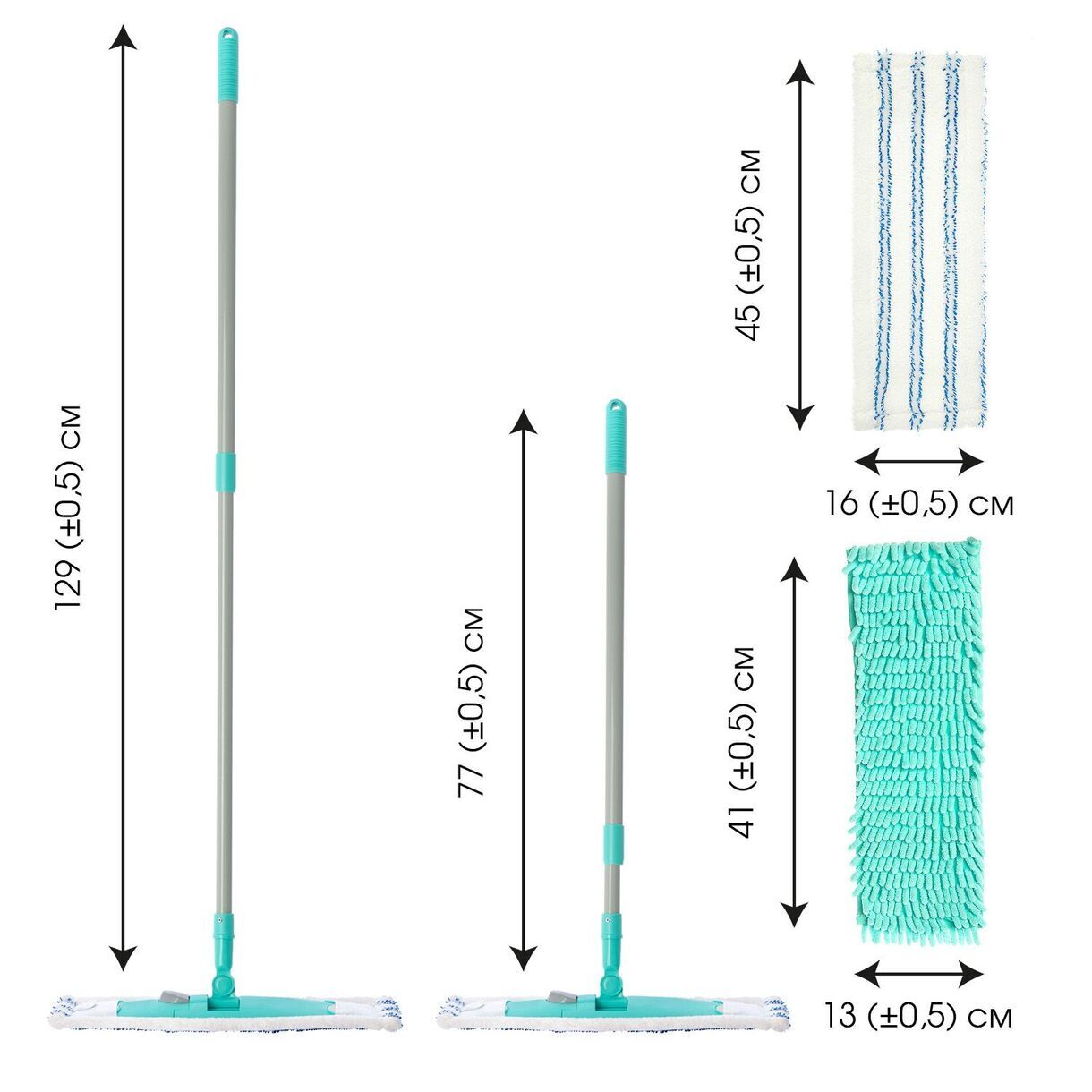 Телескопическая рукоятка: 70,5/120 (+/-1) см, Платформа: 39,5 х 9,7 см, насадка с абразивными полосками 44 х 14(+/-0,5) см, внутренний размер 40*11 (+/-0,5) см, размер внутренних швов кармана не менее 6,5*10 (+/- 0,5) см (ширина 11см), припуск на шов 5 мм; Насадка шенилл 41*12 (+/-0,5) см, внутренний размер 40*11 (+/-0,5) см, размер внутренних швов кармана не менее 6,5*11 (+/-0,5) см. (ширина 11см), припуски на швы 8 мм, длина шенилла 2,5 (+/- 0,5) см.Общая высота швабры 131 (+/-1) см.
