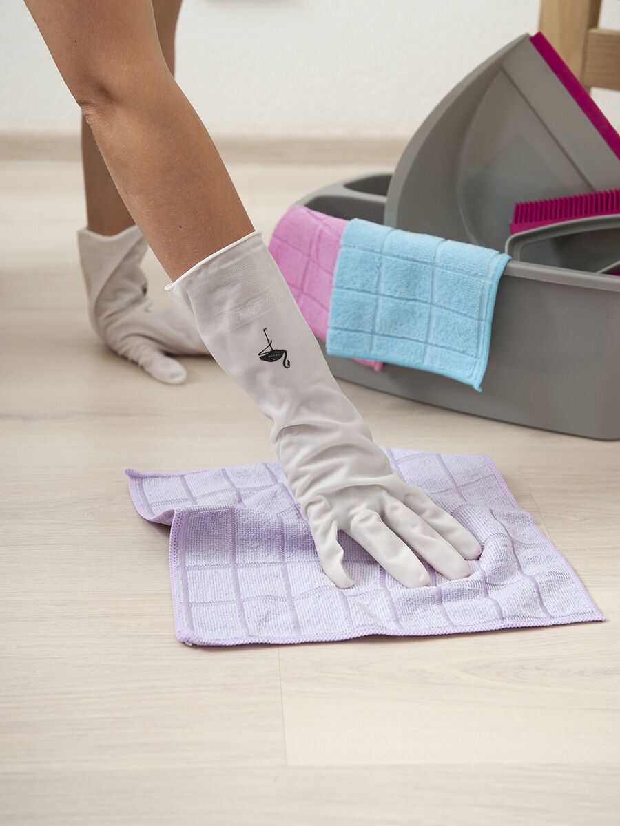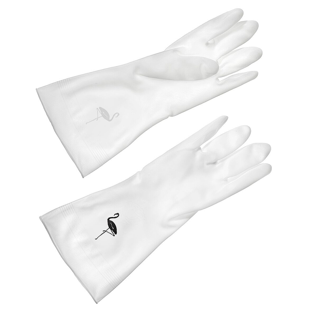 Комплектация - перчатки 1 пара Длина 30+/-1 см, ширина ладони 10,5+/-1 см, вес (с упаковкой) 59+/-3 г, вес (без упаковки) 55+/-3 г. Цвет - белый (без цветных разводов), черное изображение фламинго. Состав: ПВХ