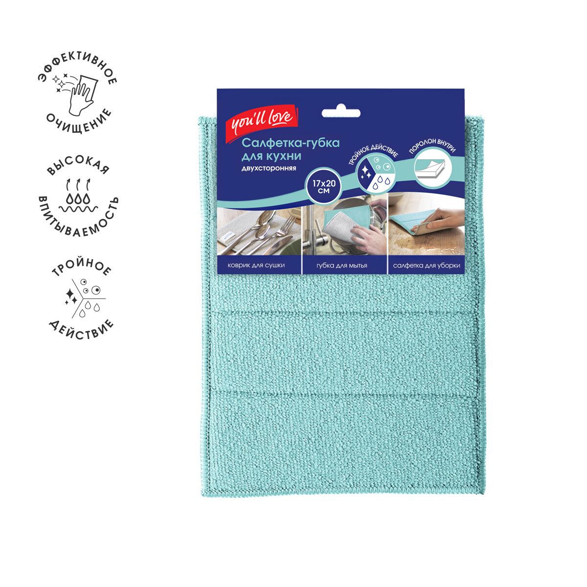Двухсторонняя салфетка-губка для кухни из микроволокна. Подходит как для сухой, так и для влажной уборки любых типов поверхностей, особенно на кухне.