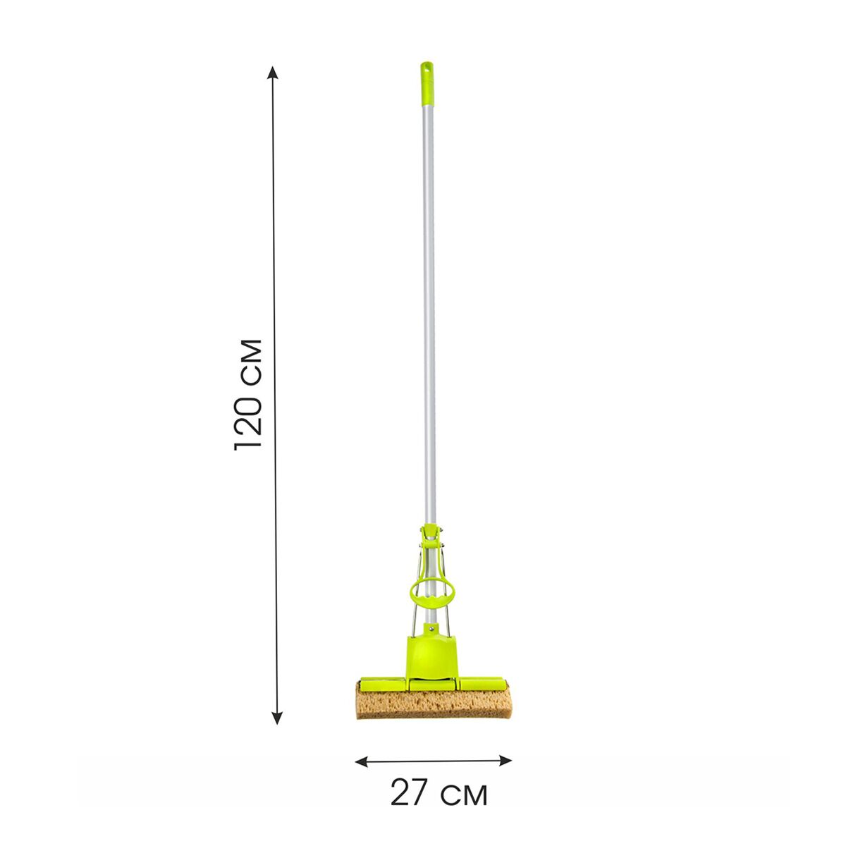 Рукоятка цельная 115 см, насадка: 27 х 9,5 х 7 см. Общая высота изделия 121 см.