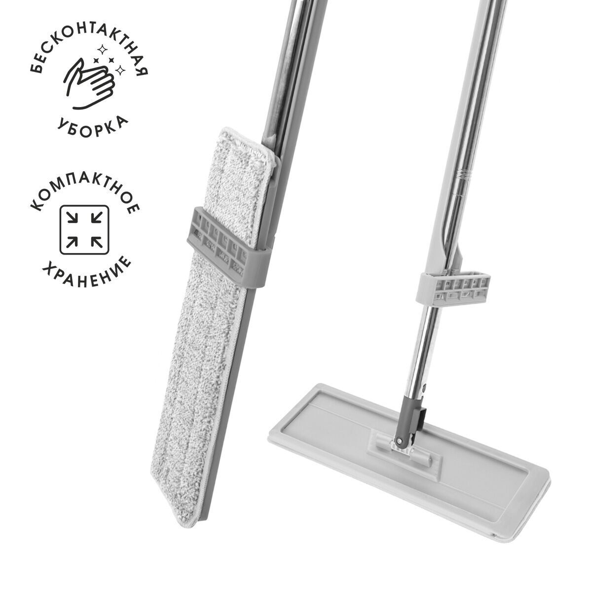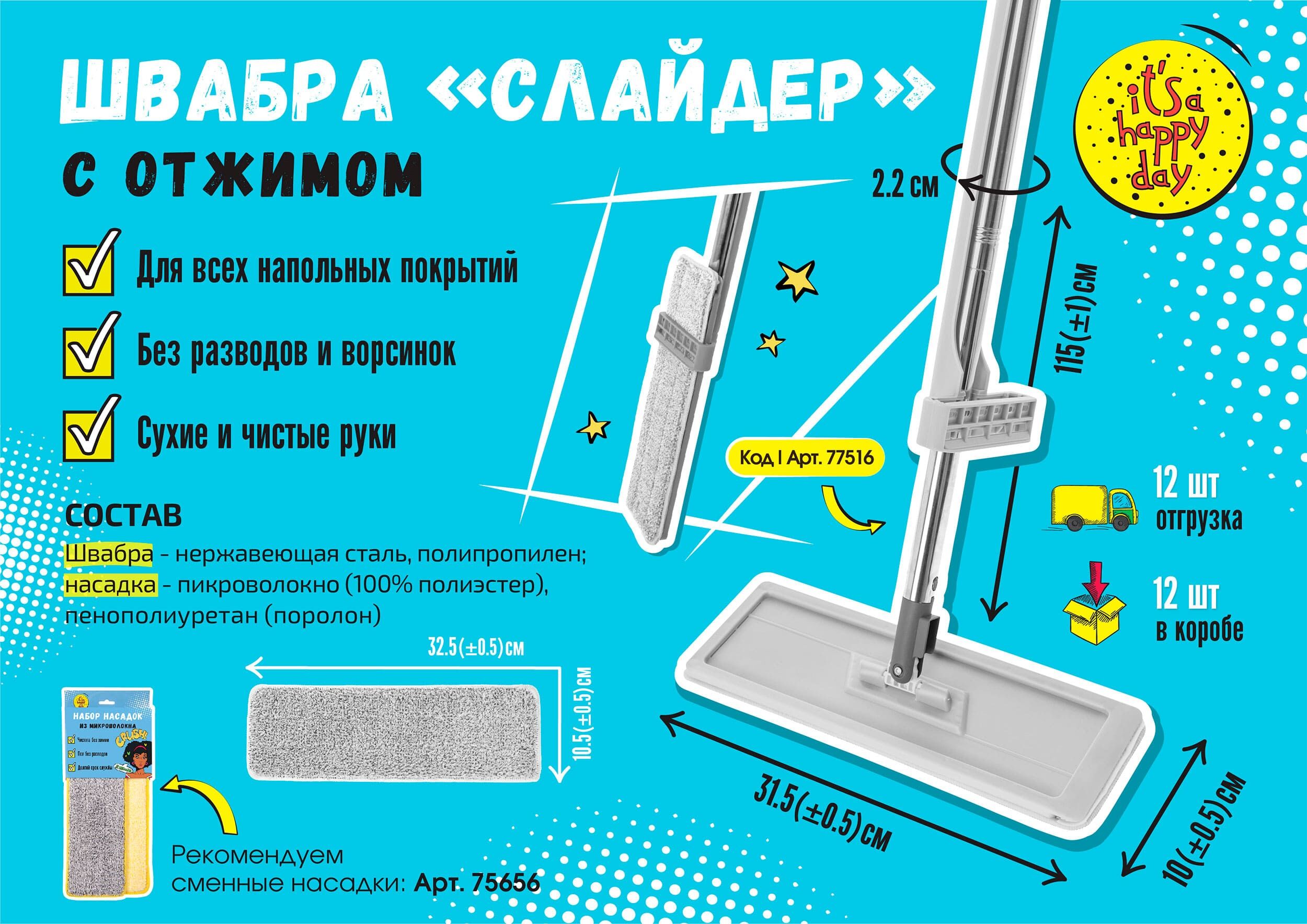 Состав: Швабра - Нержавеющая Сталь, Полипропилен; Насадка - Микроволокно (100% Полиэстер), Пенополиуретан (Поролон)