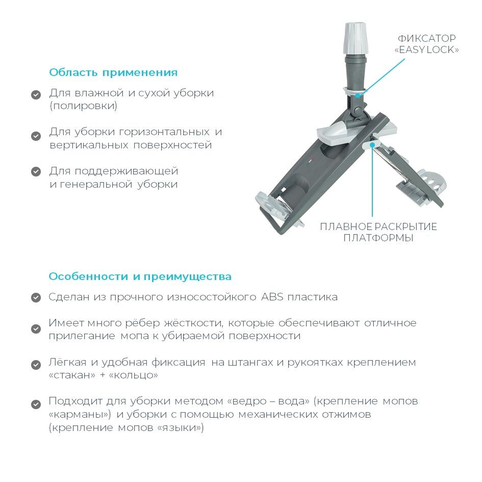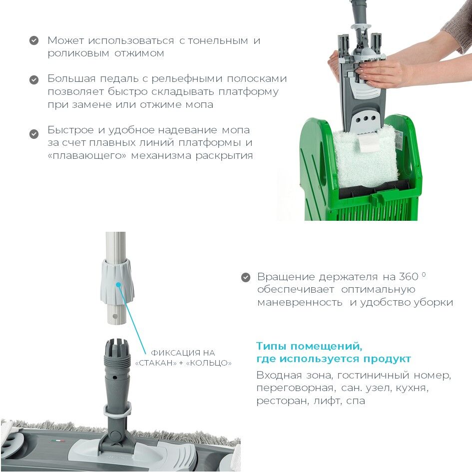 * Подходят для уборки методом «ведро – вода» (крепление мопов «карманы») и уборки с помощью механических отжимов (крепление мопов «языки»)