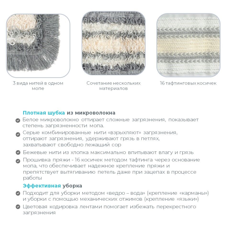 * Моп легко скользит по полу, благодаря петельчатой структуре пряжи