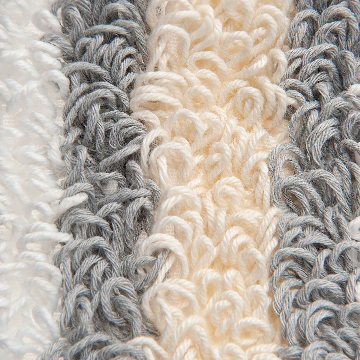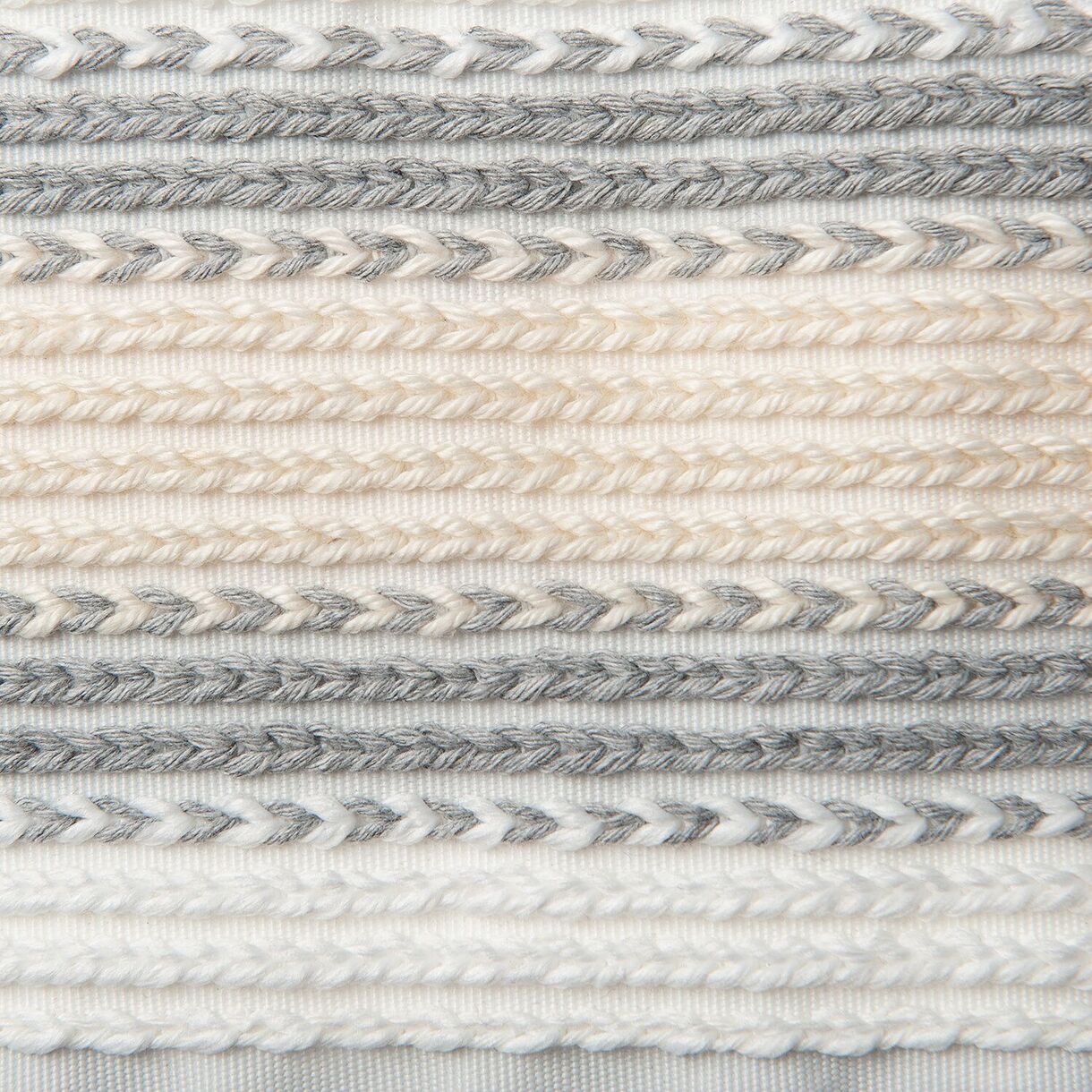 Пряжа: серая пряжа (60% хлопок, 40% полиэстер), белая пряжа (100% полиэстер), бежевая пряжа (60% хлопок, 40% полиэстер) Карманы: полиэстер, окантованы белой тесьмой. Ленты: 100%полипропилен (плетеная лента с обработанным краем)