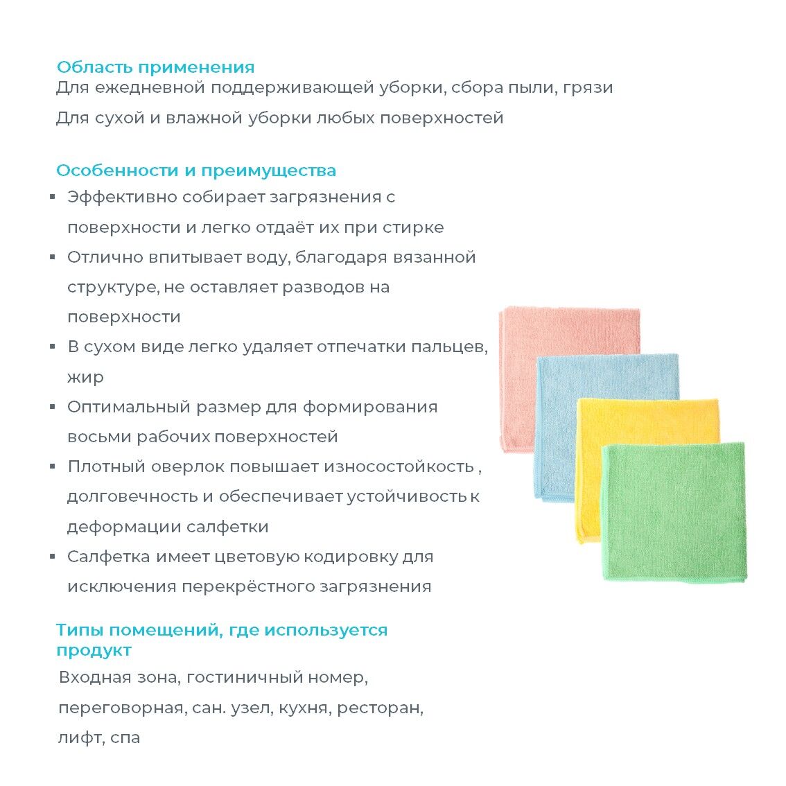 300 циклов стирки. Впитываемость 400%. Подходит для структурированных и неструктурированных поверхностей; легких, средних загрязнений. Устойчивость к щелочным и кислотосодержащим моющим средствам; устойчивость к дезинфектантам; устойчивость к автоклавированию.