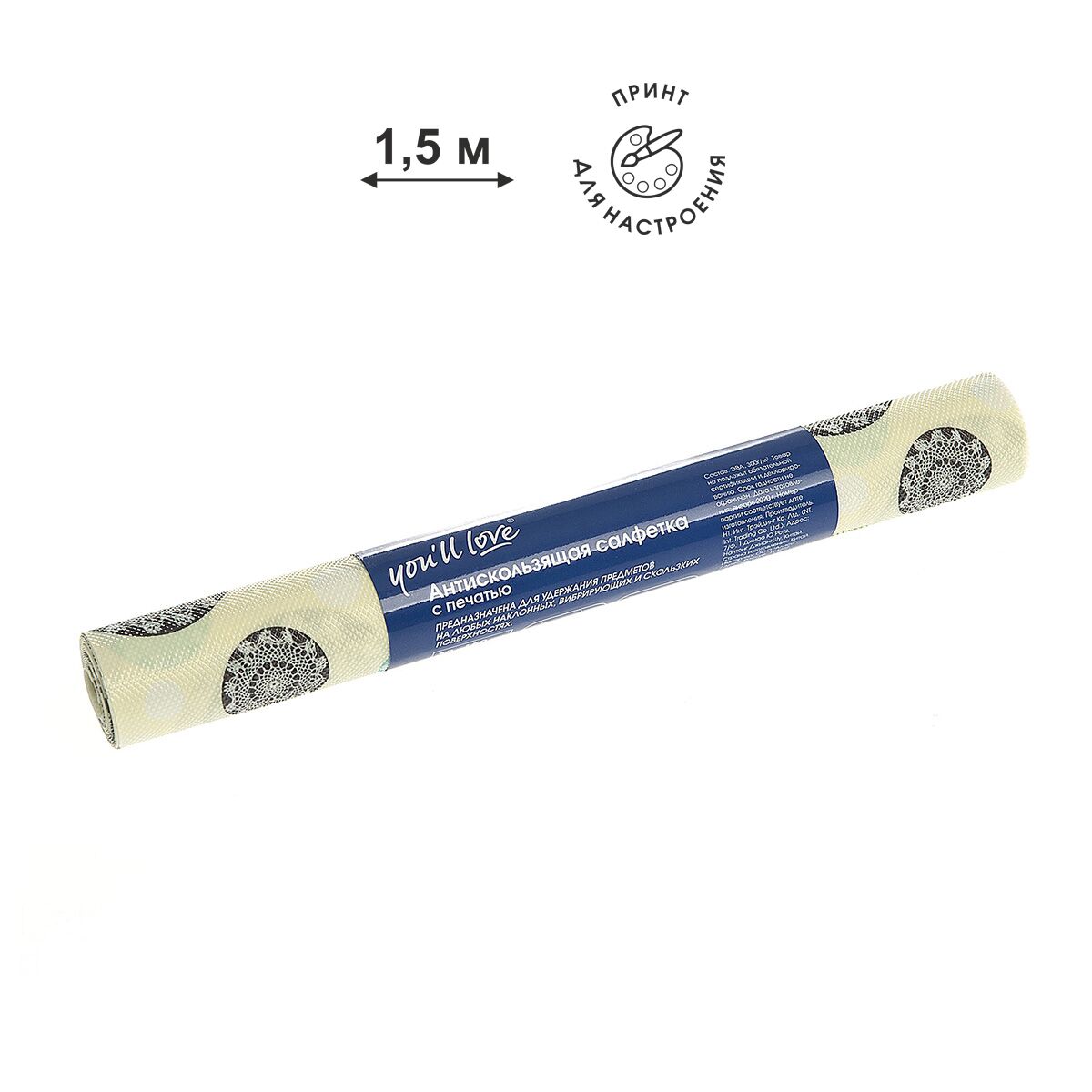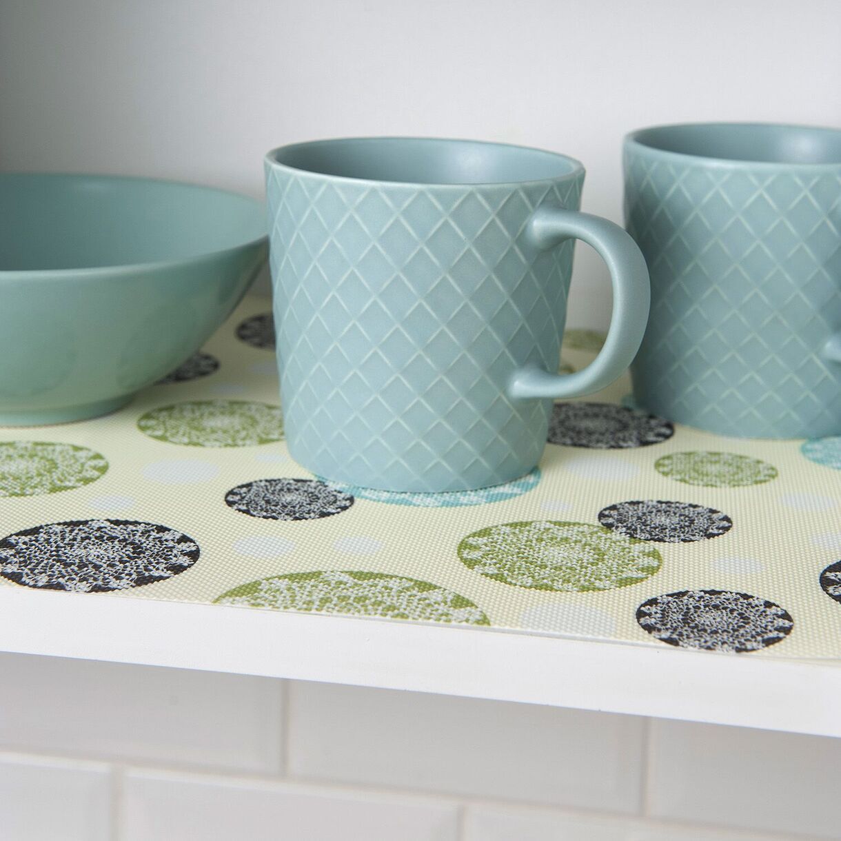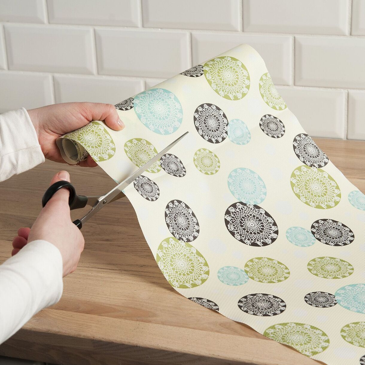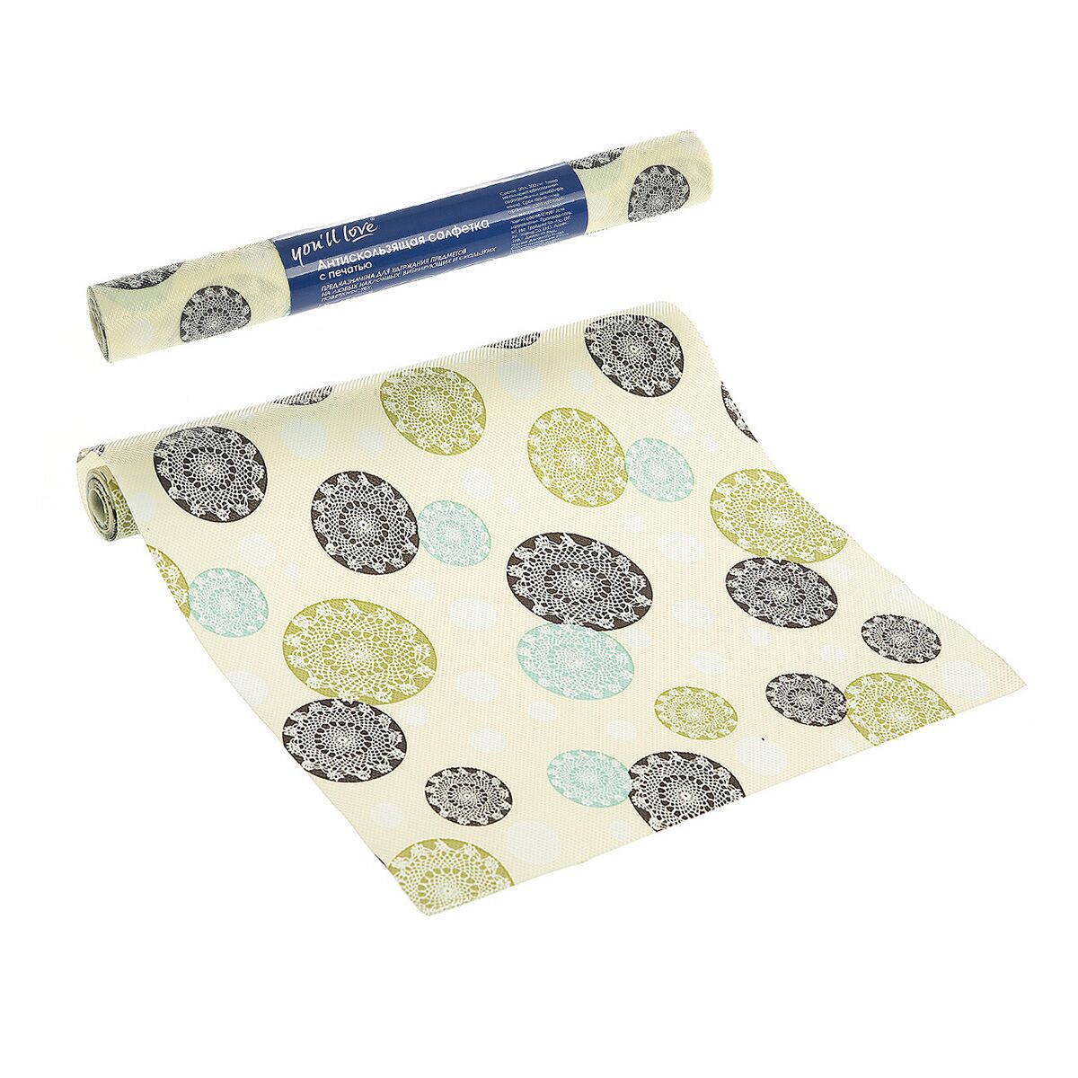 Вес без индивидуальной упаковки: 145+/-5г. Вес с упаковкой: 150+/-5г. Размер: 30*150см. Размер на полке: 30*4*4см. Состав: Этиленвинилацетат (ЭВА) 300г/м2. Цвет: молочно-белый с принтом из серых и зелено-голубых узоров.. Упаковка: цветная бумажная обечайка.