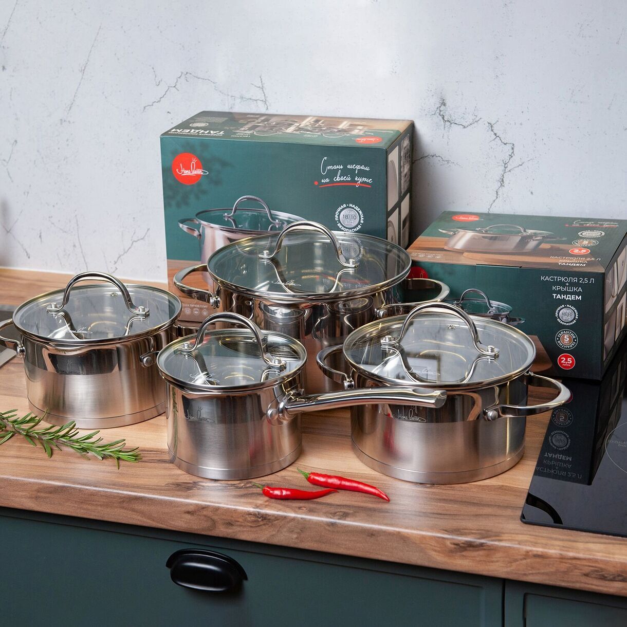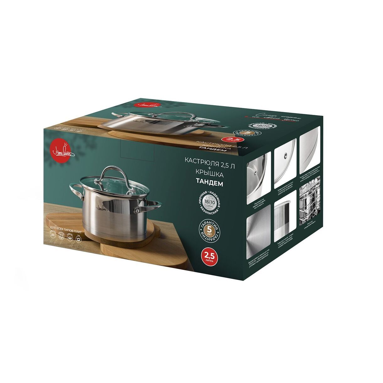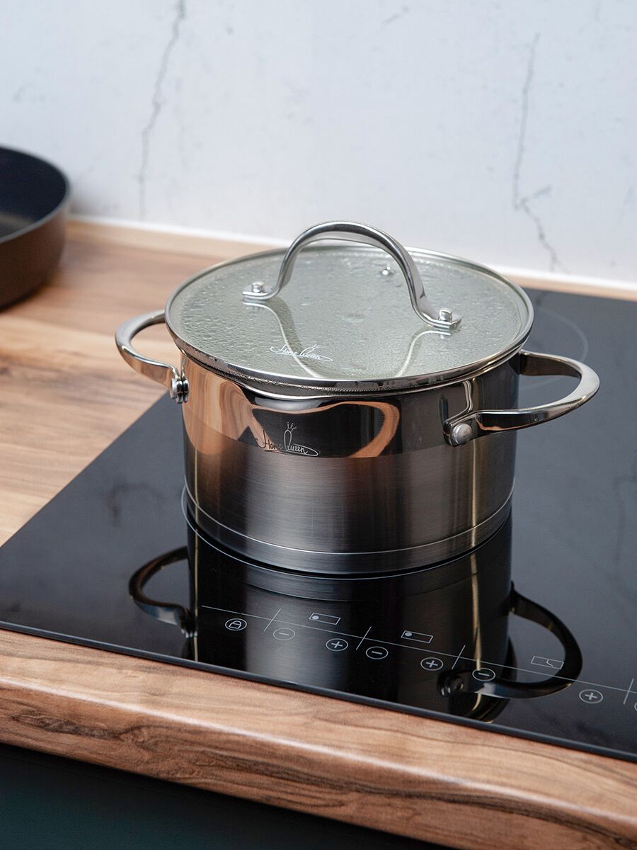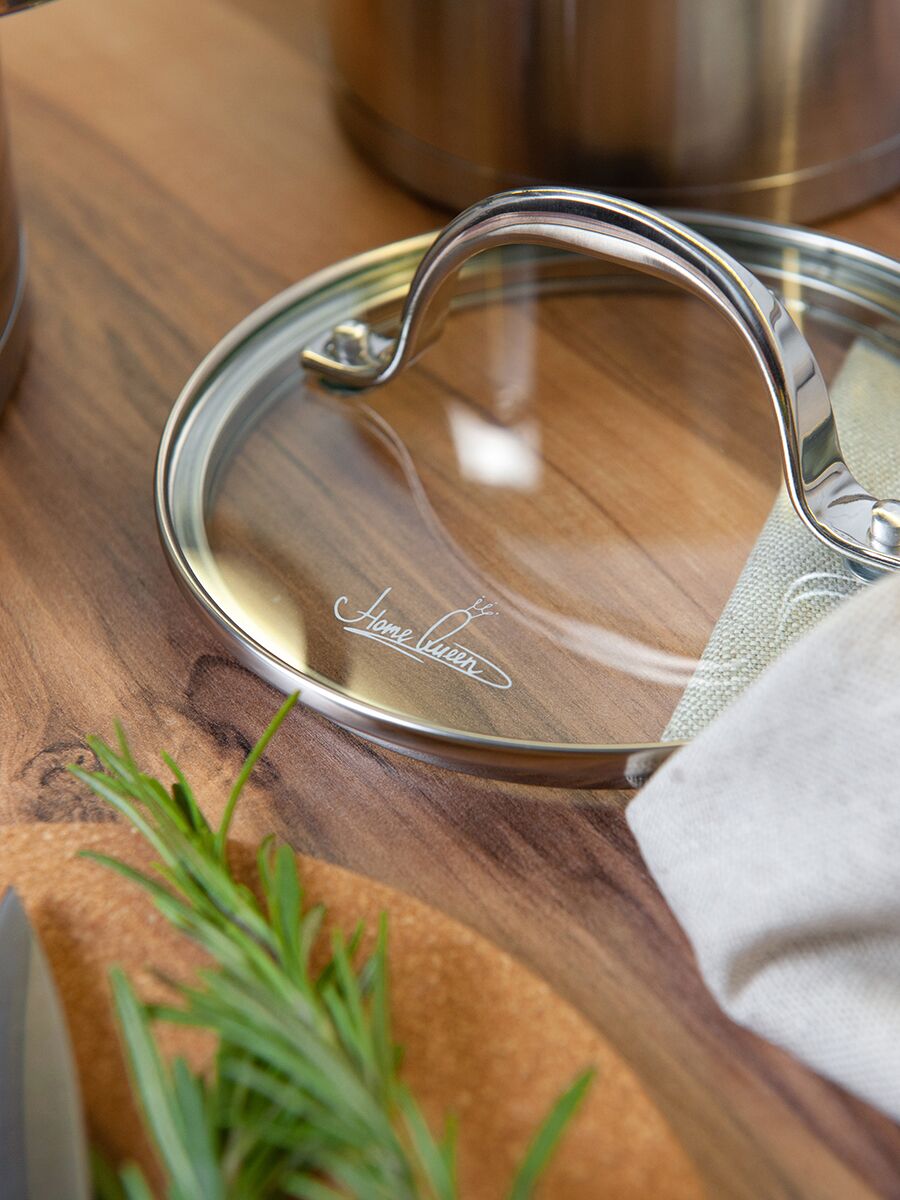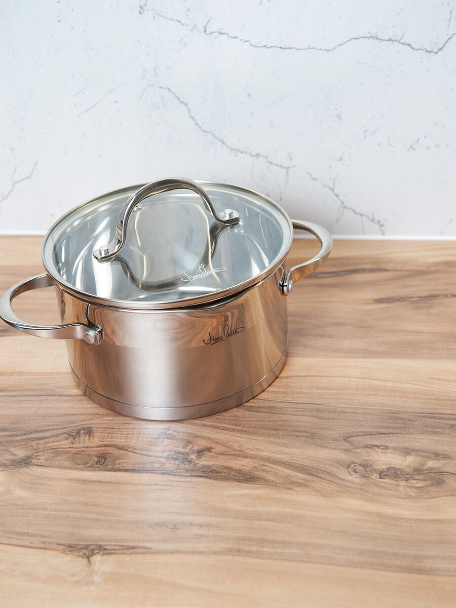 Материал изделия: нержавеющая сталь 18/10 (AISI 304). Ручка - нержавеющая сталь AISI 201, крепления ручки - алюминий. Крышка: закаленное стекло и нержавеющая сталь AISI 201. Четырехслойное теплораспределительное дно толщиной 3,5 мм. Толщина стенок 0,5 мм. Подходит для всех видов плит, включая индукцию. Размер: D 18 см, общий объем (объем кастрюли до краев) - 2,5 л, полезный объем (объем кастрюли, рекомендованный для кофортного использования) - 2,3 л, вес 1210 г.