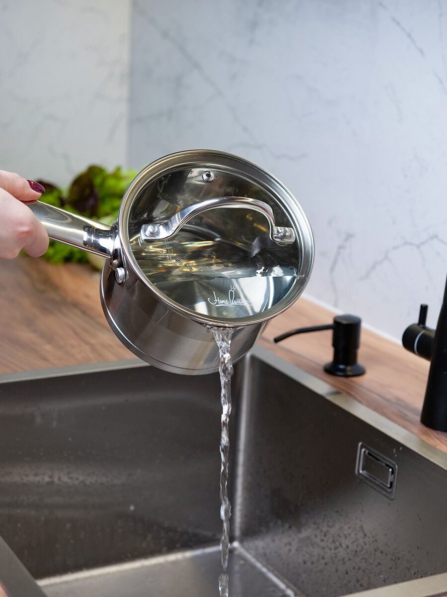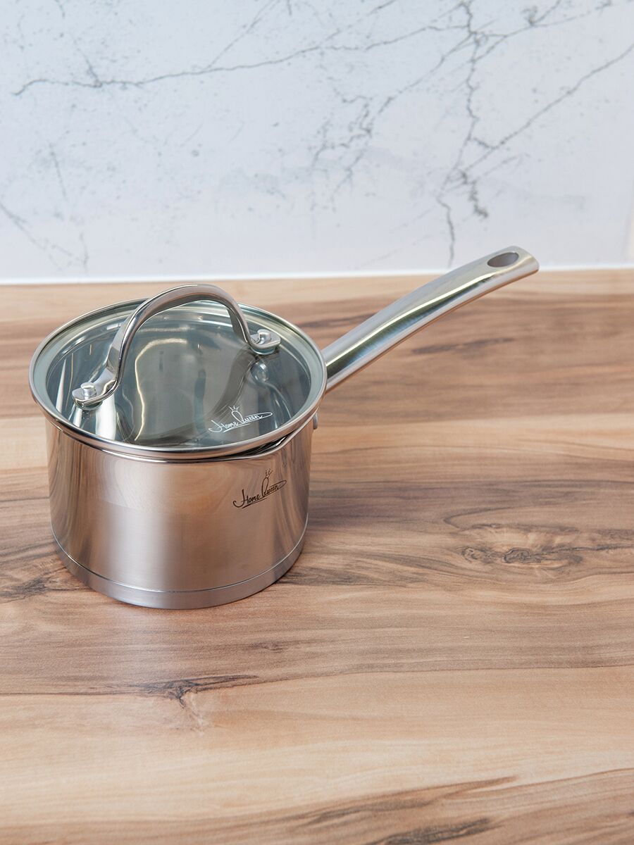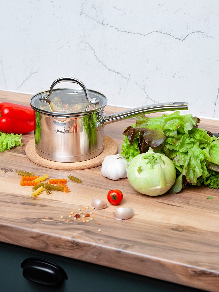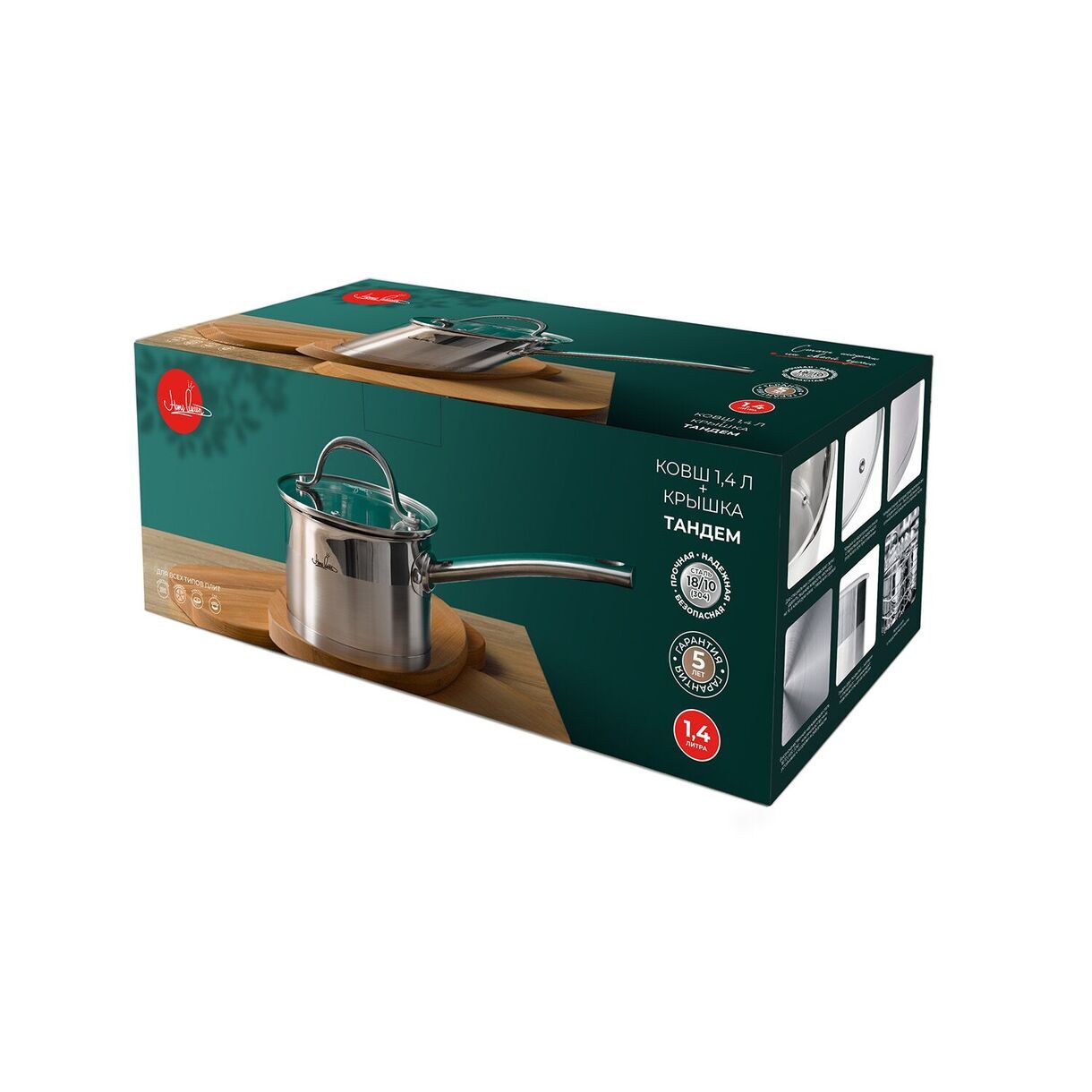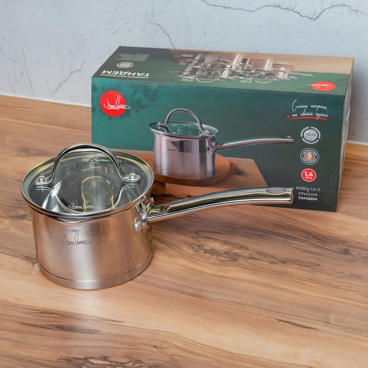 Материал изделия: нержавеющая сталь 18/10 (AISI 304), ручка - нержавеющая сталь AISI 201, крепления ручки - алюминий. Крышка: закаленное стекло и нержавеющая сталь AISI 201. Четырехслойное теплораспределительное дно толщиной 3,5 мм. Толщина стенок 0,5 мм. Подходит для всех видов плит, включая индукцию. Размер: D 14 см, общий объем (объем ковша до краев) - 1,4 л, полезный объем (объем ковша, рекомендованный для комфортного использования) - 1,3 л, вес 800 г.