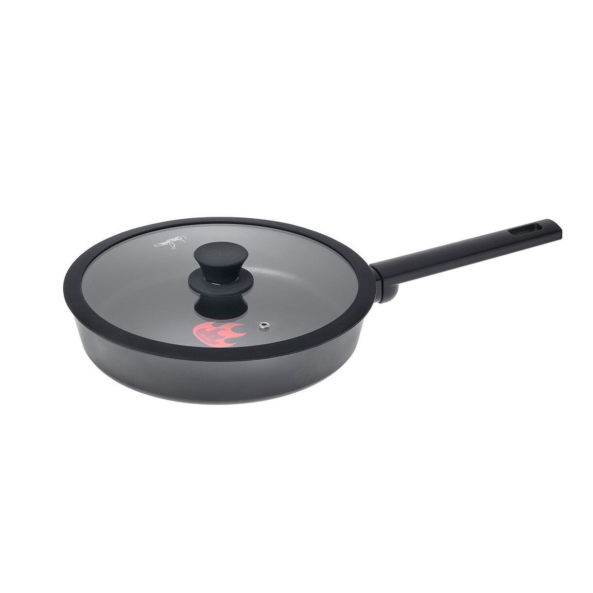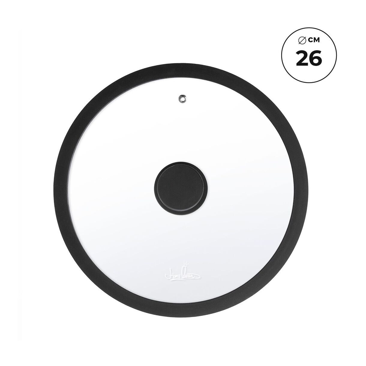 Состав: термостойкое стекло, силикон, полиамид, нержавеющая сталь. Цвет: черный. Размер: диаметр 26 см, высота 4 см. Вес без упаковки 586 +/- 10 г, вес с упаковкой 615 г +/- 10 г