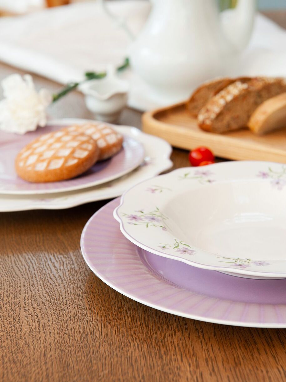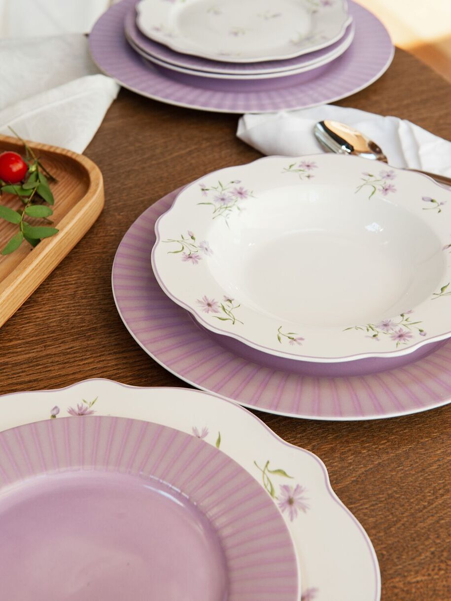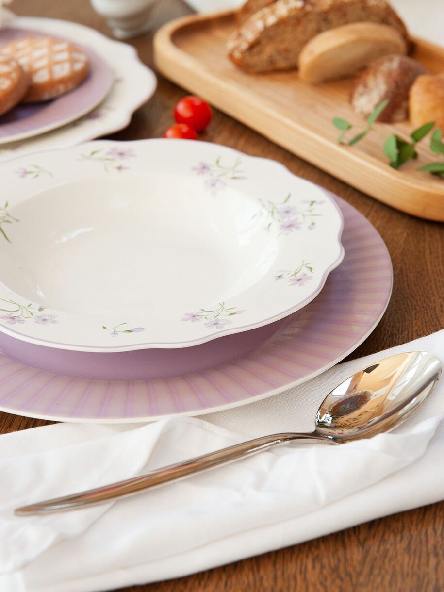 Посуда из костяного фарфора New Bone China. Суповая тарелка коллекции "Летние воспоминания" - это идеальное сочетание функциональности и эстетики. Здесь мы возвращаемся к принту мильфлер – узору из множества цветов. Основной цвет коллекции – цвет нежной пудровой лаванды. Он присутствует на тарелках с принтом в виде аккуратных букетов и повторяется в однотонных тарелках, объединяя разные формы в единый ансамбль. Форма тарелки специально разработана для комфортной подачи и удобного использования. Она идеально подходит для различных видов супов, будь то ароматный крем-суп или пикантный гаспачо. Деликатная цветная каемка обрамляет цветущее пространство тарелки, добавляя еще больше изящества и элегантности, погружая в атмосферу ностальгии и летних воспоминаний. Тарелка легко моется и устойчива к высоким температурам. Отличительными особенностями коллекции являются: легкий вес при высокой износостойкости; специальный трехступенчатый обжиг, делающий предметы максимально прочными и красивыми - качество, которое видно невооруженным глазом.Перед первым применением рекомендуется промыть. Рекомендуется ручная мойка с помощью щадящих моющих средств. Можно мыть в посудомоечной машине. Можно использовать в микроволновой печи, кроме режима "гриль". Не использовать на открытом огне, в духовках, на варочных панелях любого типа.