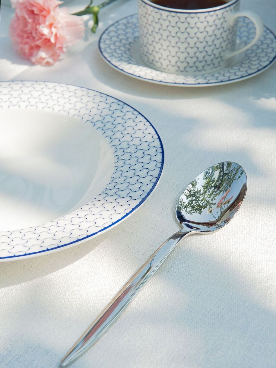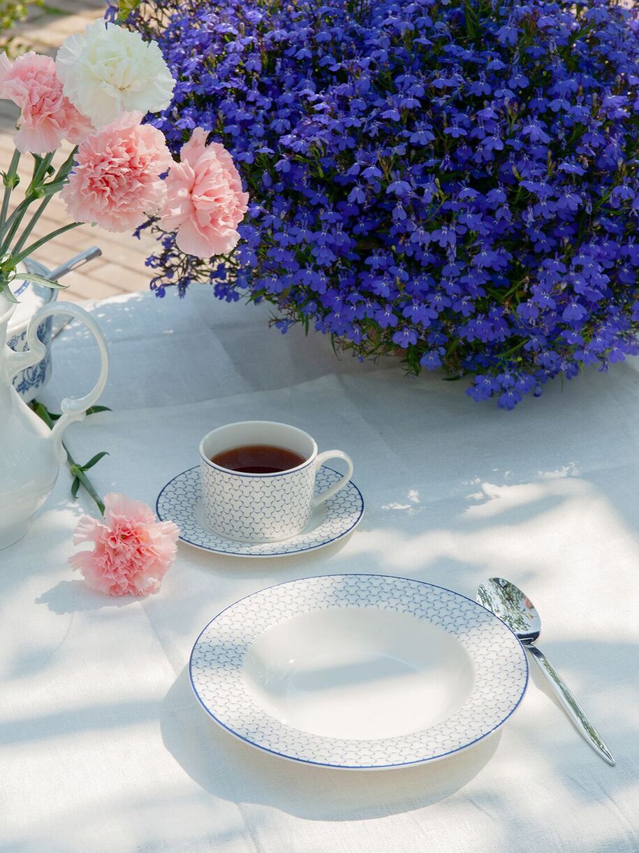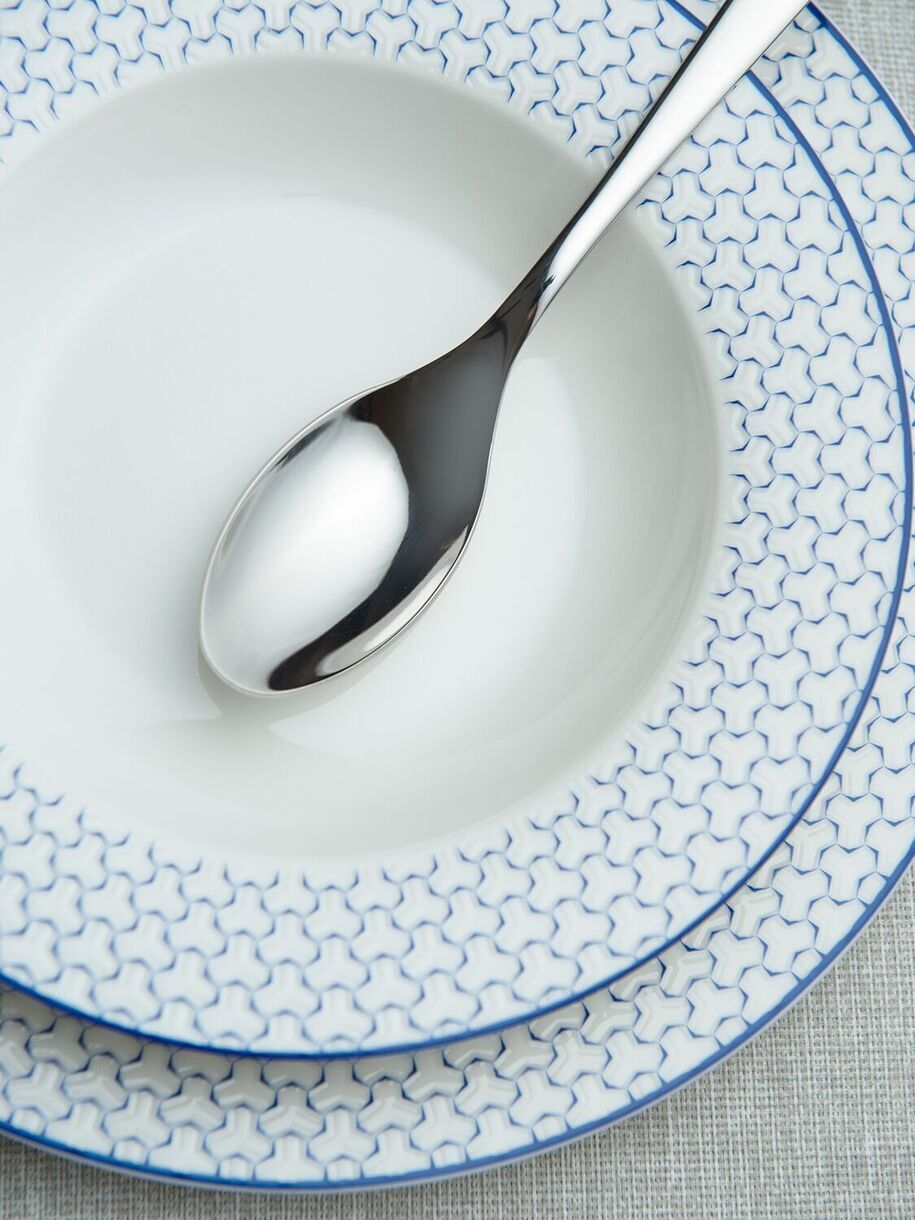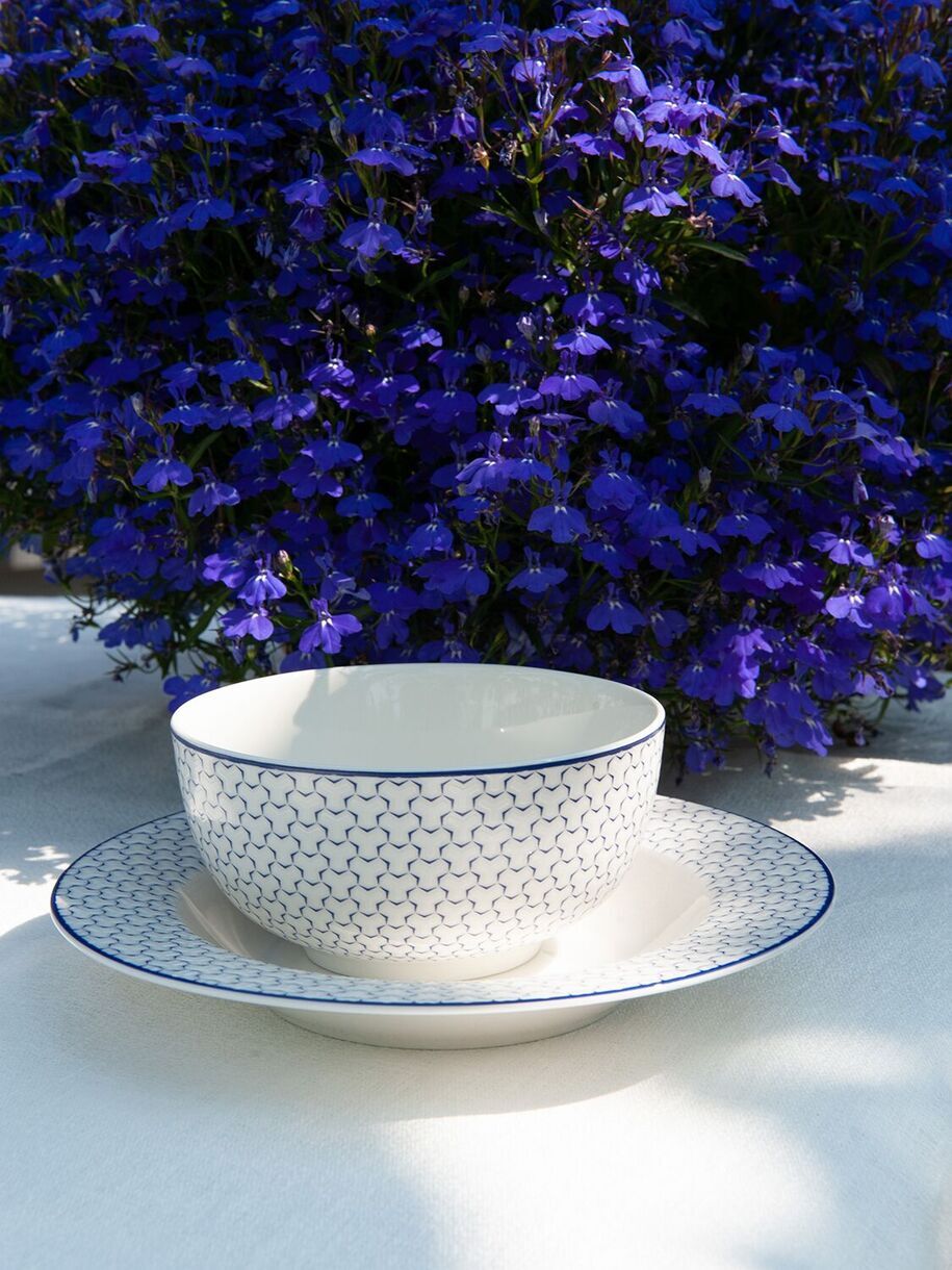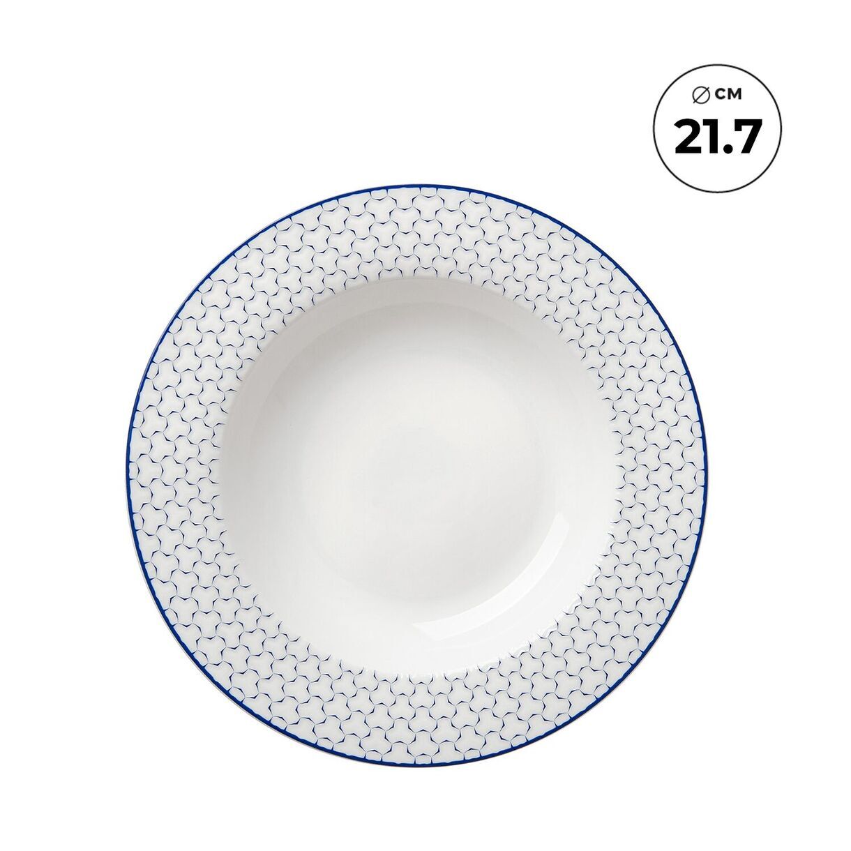 Посуда из костяного фарфора New Bone China. Изысканная суповая тарелка из классической коллекции "Воздушная" станет идеальной основой не только для классических блюд, но и для экспериментов. Благородное сочетание белого и синего цветов делают коллекцию элегантной и изысканной. Геометричные линии и насыщенный синий цвет суповой тарелки прекрасно подойдут для подачи как ярких горячих крем-супов зимой, так и для подачи холодных - летом. Несмотря на классическую палитру, новое прочтение геометричного принта создает стильный и современный дизайн, который придаст изысканности любому обеду.